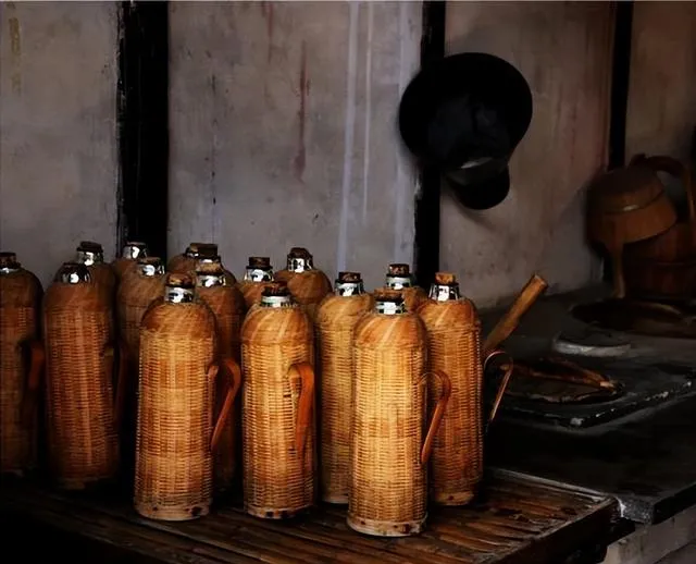 这一排整齐的长身子竹壳热水壶,老屋饭桌下总得有一个,外头一圈竹编仔细包着,里面是白白亮亮的壶胆,冬天喝口烫水、夏天泡壶茶,随手一拎就走,壳子手感特别滑,又轻又结实,奶奶用纱布系紧壶嘴说不容易烫,这种竹壳的现在真不多了,玻璃的不经摔,全靠那个竹套子护着劲头。