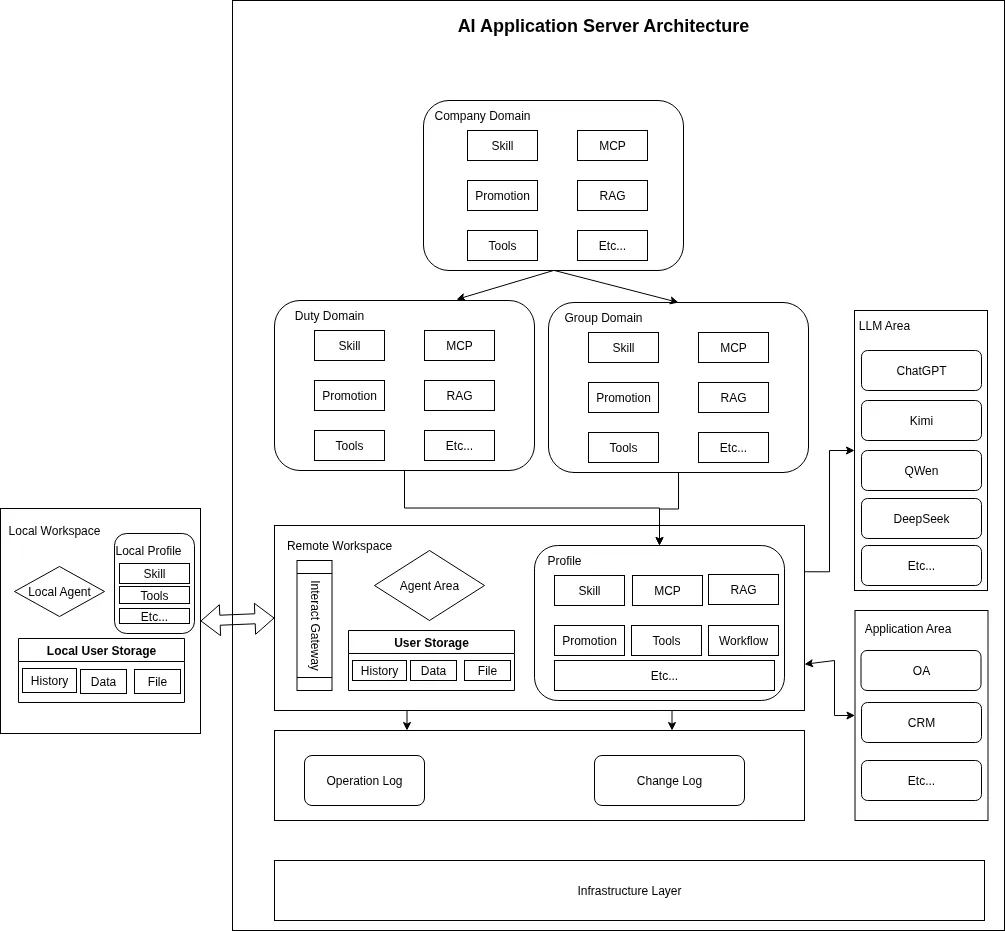 由于主体功能部署在服务端,因此,数据和功能属主完全属于企业,企业有完整的所有权;AI技能和功能通过不同域设置,由于经过专家审议,因此安全性也有了保障;同时,结合MCP和Skill等,现存的应用也可以快速赋能,通过AI能力可以进行逐步开放,能够控制AI化节奏;不同的Profile不但实现了千人千面,也可灵活自定义增加能力,支持小范围灰度验证也可快速迭代支持,数字人也可在这里进行逻辑抽象;Agent区域和LLM区域配合,以配置和插拔方式部署,不但可以快速体验最先进的AI能力,在快速推进覆盖时可使用类似Docker的方式升级;存储区域独立,用户使用数据隔离,既确保了安全性,也可以不受Agent升级影响;操作留痕,审计可以确保操作安全,而类似git之类的变更记录,可确保一切数据可回溯。