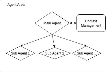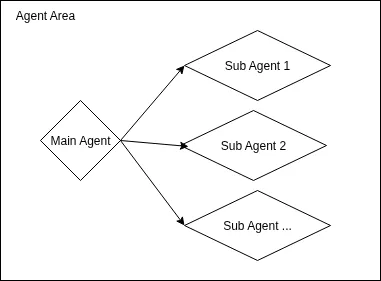 第一种见上图,为主Agent模式,执行特殊或者特定目标任务时,可以通过Sub Agent来工作。也可以简化一下,即具备上下文切换能力的Agent. 现阶段主流Agent其实是这种模式。结合以前的客户端开发经验来讲,这种模式可以与客户端软件里的主线程-工作线程作为对比,因此Sub Agent就像一个个子线程。
