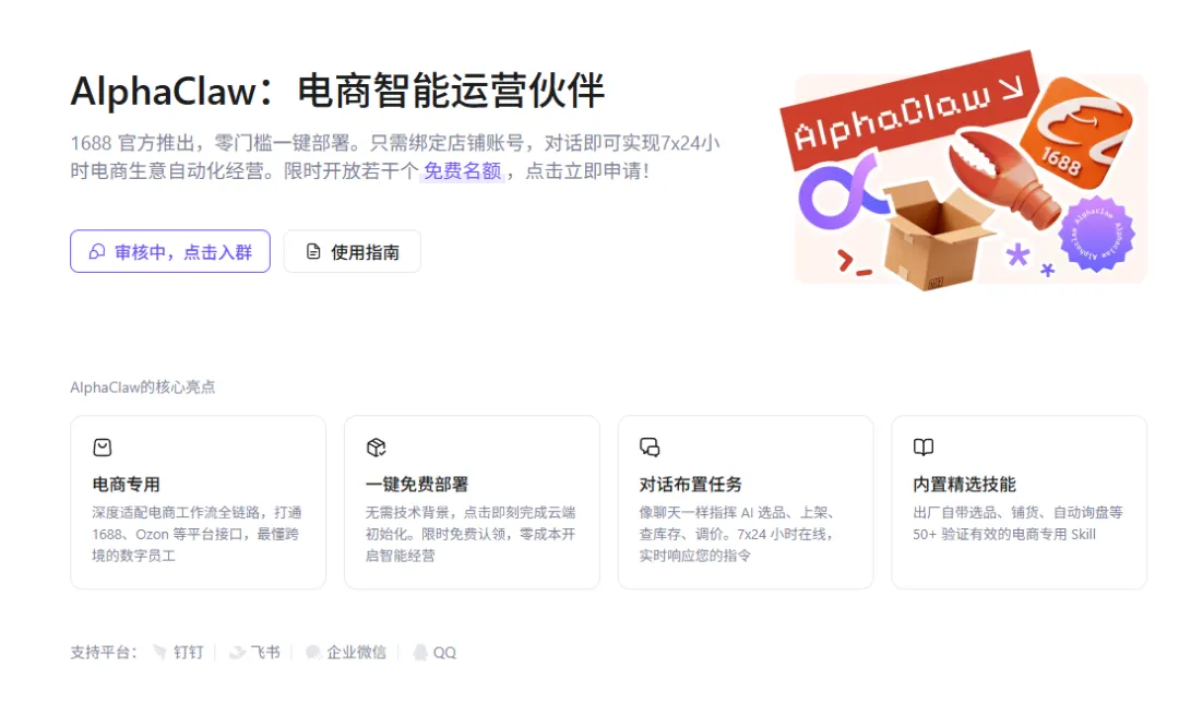 遨虾(Alphashop)是阿里巴巴1688官方推出的AI智能体,简单理解更像是1688的AI采购助手。
