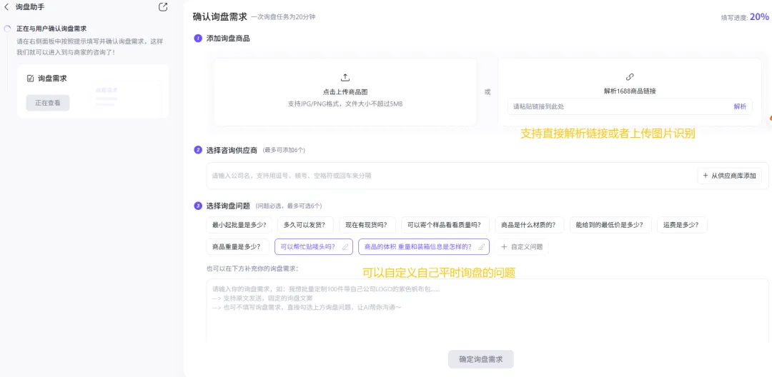 你可以预设自己的问题清单。比如我做独立站,贴唛头和定制包装是刚需,我就会把这些问题加进去。遨虾会带着你的所有问题去问每个供应商。