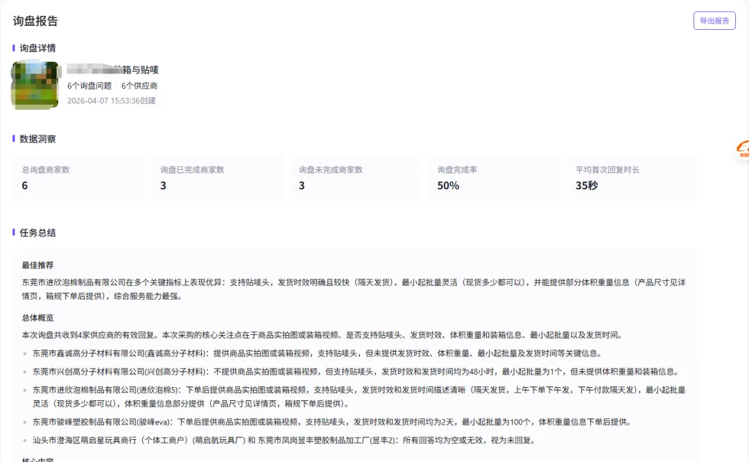智能询盘+报告功能对于需要管理大量供应商的卖家来说,效率提升非常明显。