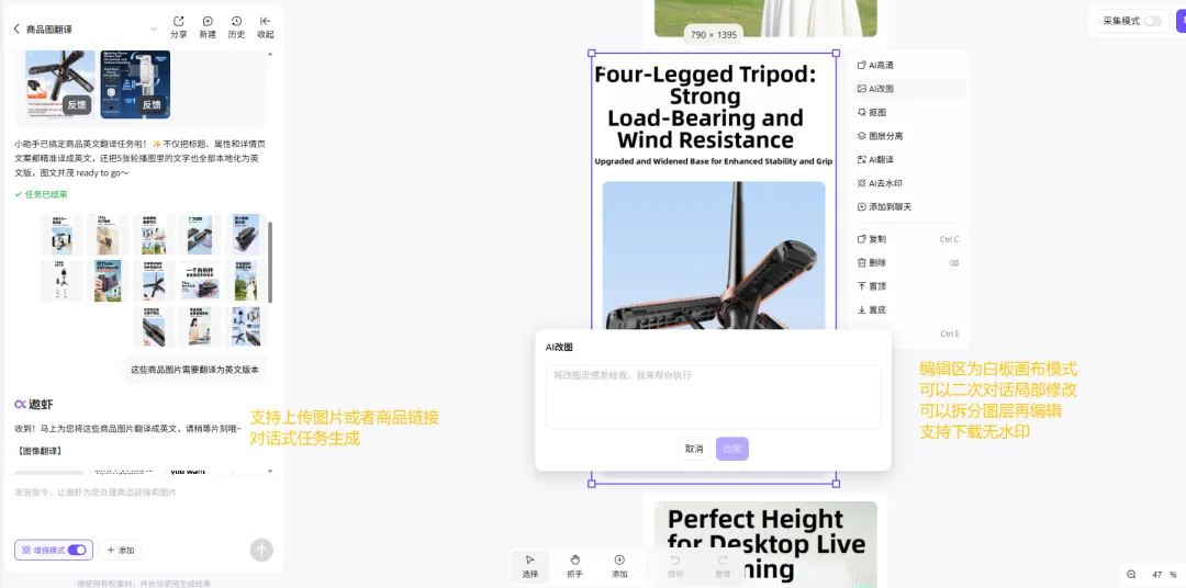 这种”对话式图片编辑”的体验,比传统的PS或在线编辑器要友好得多,尤其是对于不会设计的卖家。
