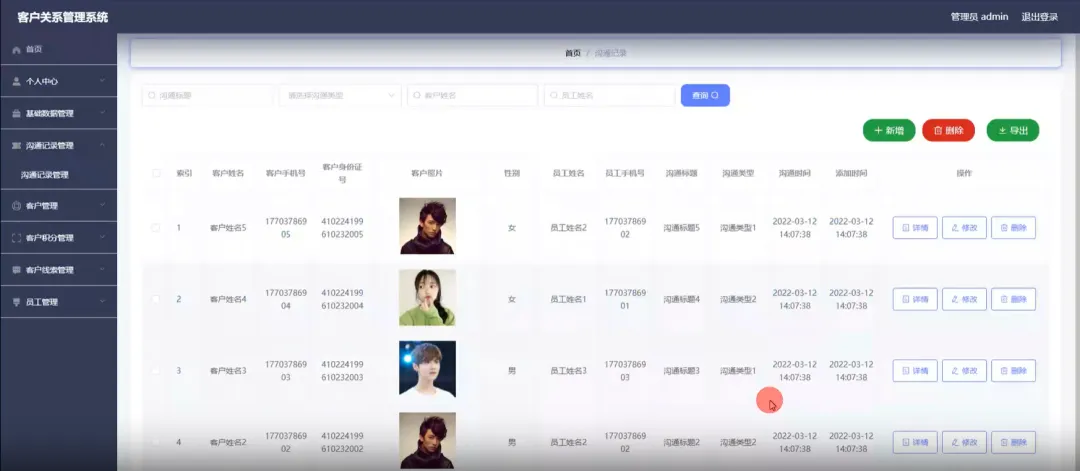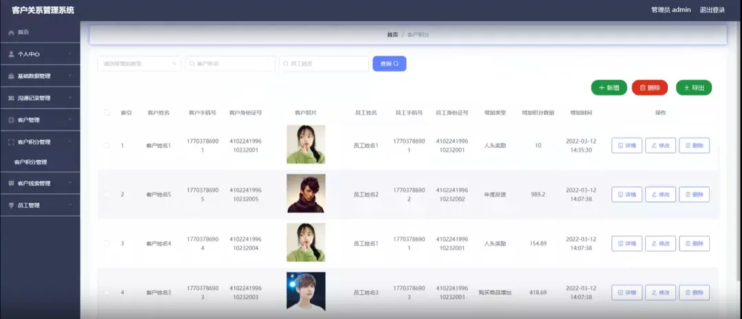 – 管理员功能:字典管理、沟通记录管理、客户管理、客户积分管理、客户线索管理、员工管理、管理员管理等