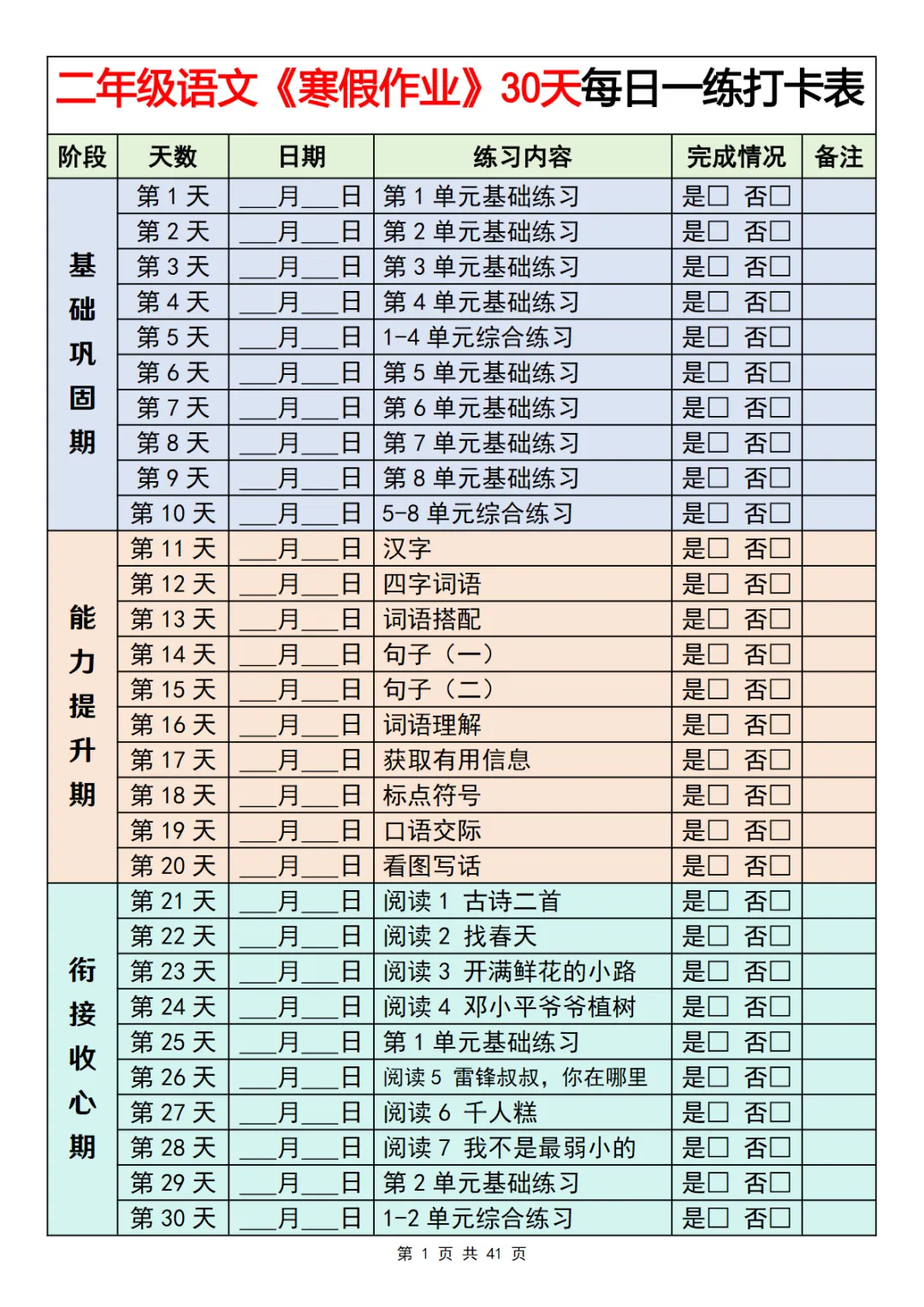 二年级下语文寒假作业每日一练30天 电子版可打印