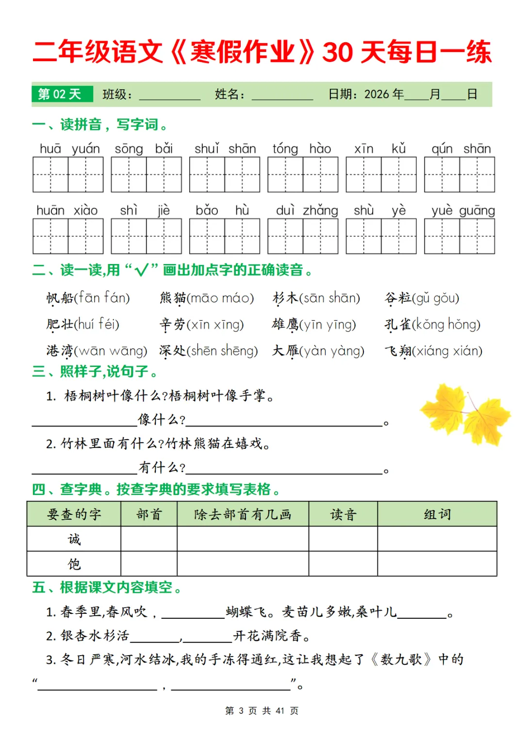 二年级下语文寒假作业每日一练30天