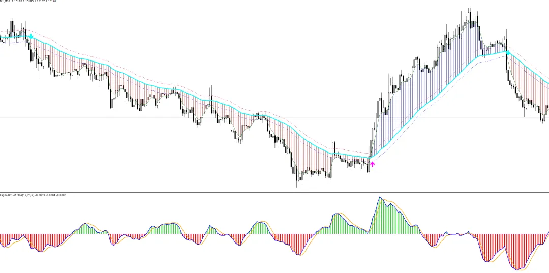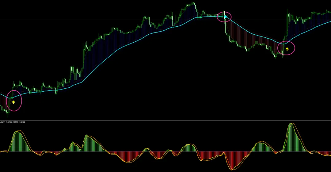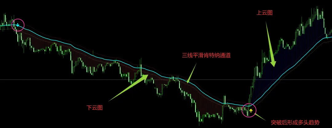 我们将肯特纳通道进行平滑处理,结合云图趋势,将趋势转折直观化,在主图给予箭头信号提示