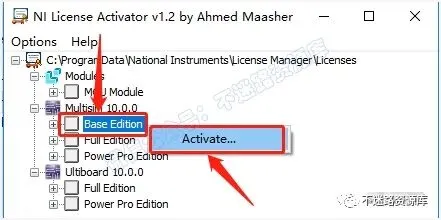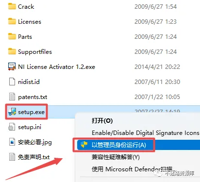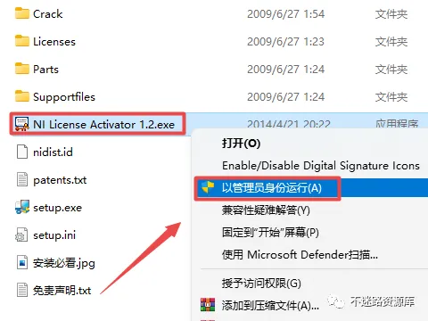 11.返回之前解压的“Multisim10.0”文件夹,找到并选中“NI License Activator 1.2.exe”,鼠标右键点击“以管理员身份运行”
