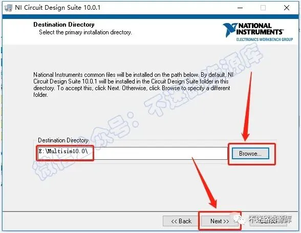 5.点击“Browse”可以选择软件安装路径,建议和教程中的保持一致,本例安装到E盘(将路径地址中的首字符C改为D表示安装到D盘,可在D盘或者其他盘创建一个“multisim10.0”文件夹,安装路径不要出现中文),点击“Next”
