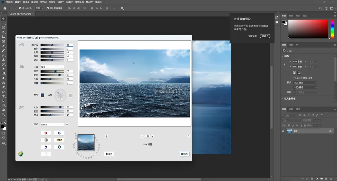 • 易用性: 相较Ps自身复杂的水波制作过程,Flood 提供了简便的界面和预设,让普通用户也能快速上手。