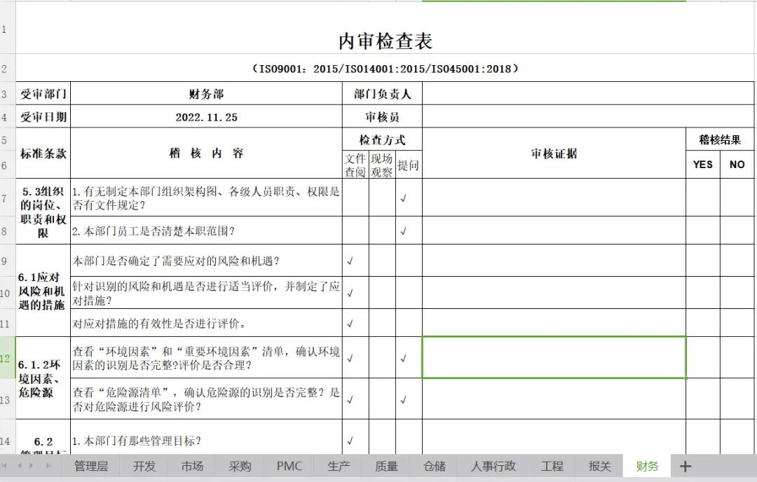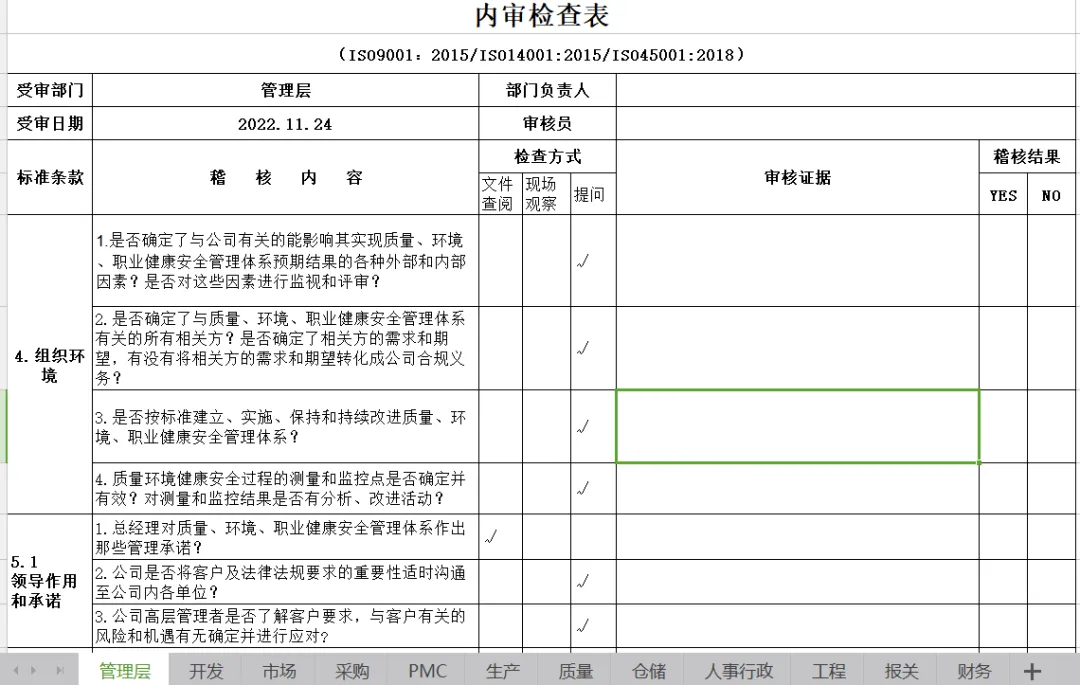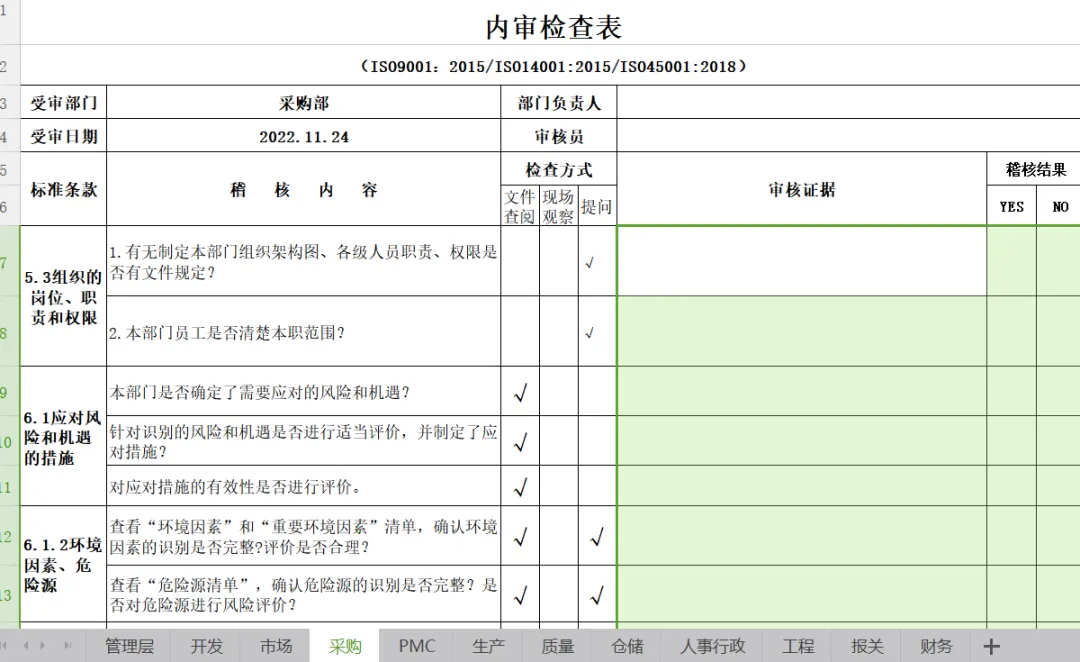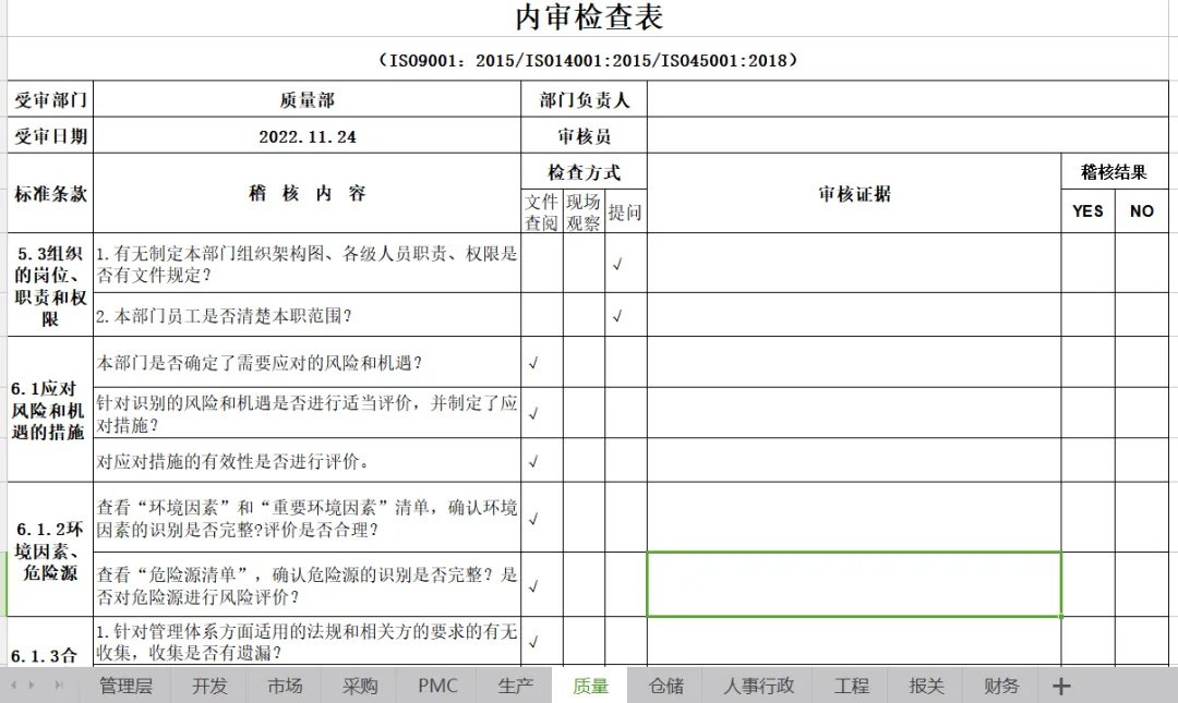 三标体系内审检查表-Excel档分享!ISO9001:2015/ISO14001:2015/ISO45001:2018内审表 体系管理-阅读正文 2. 三标体系内审检查表 ISO9001:2015/ISO14001:2015/ISO45001:2018 管理层 受审部门 管理层 部门负责人 受审日期 2022.11.24 审核员 标准条款 稽核内容 检查方式 文件查阅 现场观察 提问 4.组织环境 1.是否确定了与公司有关的能影响其实现质量、环境、职业健康安全管理体系预期结果的各种外部和内部因素?是否对这些因素进行监视和评审? √ 2.是否确定了与质量、环境、职业健康安全管理体系有关的所有相关方?是否确定了相关方的需求和期望,有没有将相关方的需求和期望转化成公司合规义务? √ 3.是否按标准建立、实施、保持和持续改进质量、环境、职业健康安全管理体系? √ 4.质量环境健康安全过程的测量和监控点是否确定并有效?对测量和监控结果是否有分析、改进活动? √ 5.1领导作用和承诺 1.总经理对质量、环境、职业健康安全管理体系作出那些管理承诺? √ 2.公司是否将客户及法律法规要求的重要性适时沟通至公司内各单位? √ 3.公司高层管理者是否了解客户要求,与客户有关的风险和机遇有无确定并进行应对? √ 5.2质量、环境、健康安全、方针 1.公司是否制定了质量、环境、健康安全方针? √ 2.质量、环境、健康安全方针是否形成文件? √ 3.公司如何宣传质量、环境、健康安全方针? √ 5.3组织的岗位、职责和权限 1.有无制定公司组织架构图,各个部门、各级人员职责、权限及其相互关系是否确定并予以沟通? √ 2.组织所有员工是否清楚本职范围并被有效沟通履行? √ 6.1应对风险和机遇的措施 公司确定的需要应对的风险和机遇有哪些?应对风险和机遇的措施包括哪些?如何评价这些措施的有效性。 √ 6.2管理目标及其实现的策划 1.公司制定的管理目标是否与质量、环境、健康安全、方针相一致,并可测量? √ 2.公司是否要求各阶层依据公司管理目标建立相应目标? √ 3.公司内各阶层是否针对各自管理目标进行展开与执行? √ 4.管理目标有无进行内部沟通,并适时更新? √ 6.3变更的策划 1.组织针对质量、环境、健康安全体系进行变更时,是否考虑了变更的目的及潜在后果? √ 2.组织在进行质量、环境、健康安全体系变更前是否考虑了资源的可获得性? √ 3.为实施质量、环境、健康安全体系变更,是否产生了责任和权限的分配或再分配? √ 7.1.1资源总则 1.询问管理层,公司为建立、实施、保持和持续改进管理体系提供了哪些资源? √ 2.可能需要外部提供的资源有哪些? √ 7.4信息交流 1.公司高层管理者是否建立内部各种沟通之过程? √ 2.公司相关人员(或公司对外窗口)是否建立外部各种沟通之过程? √ 3.公司内外部沟通是否维持相关记录与便追踪与确认? √ 9.2内部审核 1.是否制订管理体系年度内审计划表,“计划表”是否包含整个质量、环境、健康安全管理系统? √ 2.管理体系内审执行前后会议是否有记录? √ 3.内审之不符合事项有无矫正预防措施报告? √ 4.内审人员是否有内审资格证? √ 5.内审人员是否与被审核单位业务无关,以确认其独立性? √ 6.内审人员是否针对不符合事项之改善进行追踪与确认? √ 9.3管理评审 1.公司是否明确规定定期执行管理评审?公司是否如期召开管理评审会议? √ 2.管理评审输入内容是否充分? √ 3.管理评审提出了哪些改进措施?是否得到贯彻执行? √ 10持续改进 1..体系运行过程中是否存在不合格、环保违规、职业健康安全事故等?若有,采取了哪些纠正和纠正措施?是否对措施的有效性进行验证? √ 2.公司是如何持续改进管理体系的?采取了哪些措施? √ 开发 标准条款 稽核内容 检查方式 文件查阅 现场观察 提问 5.3组织的岗位、职责和权限 1.有无制定本部门组织架构图、各级人员职责、权限是否有文件规定? √ 2.本部门员工是否清楚本职范围? √ 6.1应对风险和机遇的措施 本部门是否确定了需要应对的风险和机遇? √ 针对识别的风险和机遇是否进行适当评价,并制定了应对措施? √ 对应对措施的有效性是否进行评价。 √ 6.1.2环境因素、危险源 查看“环境因素”和“重要环境因素”清单,确认环境因素的识别是否完整?评价是否合理? √ 查看“危险源清单”,确认危险源的识别是否完整?是否对危险源进行风险评价? √ 6.1.3合规性义务 1.针对管理体系方面适用的法规和相关方的要求的有无收集,收集是否有遗漏? √ 2.是否将对其部门适用的法律法规及其他要求进行培训与传达? √ 6.1.4措施的策划 1.针对识别出的环境、职业健康安全管理体系的内外部环境、环境因素/危险源、合规义务,有无制定管理措施? √ 2.对应对措施的有效性是否进行评价。 √ 6.2管理目标及其实现的策划 1.本部门有那些管理目标? √ 2.本部门管理目标有无进行统计分析?不达标时是否制定改善对策? √ 7.4信息交流 1.本部门内部交流主要内容有那些, √ √ 2.本部门外部交流相关有那些,主要交流内容包括那些? √ √ 3.内外部沟通是否维持相关记录与便追踪与确认? √ 7.5形成文件的信息 1.质量环境职业健康安全相关记录是否便于阅读、寻找、容易区分? √ 2.相关使用表单有无规定保存期限,有无按要求保存? √ 8.1产品运行策划和控制 2.产品实现的规划,是否规定了相关文件,及相关资源 √ 3.产品实现的规划,是否包括产品品质要求和目标? √ √