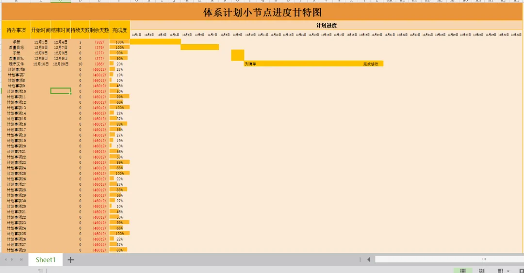 体系推行小节点实施计划-Excel档 体系管理-阅读正文 体系推行小节点实施计划 待办事项 开始时间 结束时间 持续天数 剩余天数 完成度 手册 12月1日 12月4日 3 (382) 100% 质量目标 12月5日 12月7日 2 (379) 100% 手册 12月9日 12月9日 0 (377) 90% 质量目标 12月9日 12月9日 0 (377) 90% 程序文件 12月10日 12月20日 10 (366) 20% 计划事项6 0 (46012) 27% 计划事项7 0 (46012) 19% 体系管理-资料获取 公众号内发送关键词:课件获取 点击下方阅读原文,自助下载更多资料!