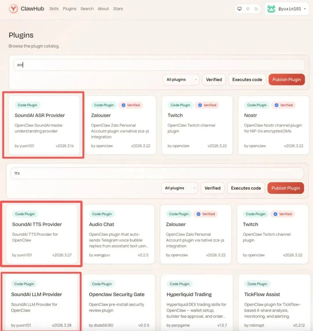近日,声智科技自主研发的语音交互插件,包含ASR(自动语音识别)与TTS(语音合成)正式通过ClawHub官方审核并接入服务;与此同时,声智自研的LLM(大语言模型)插件也已成功接入OpenClaw(龙虾)官方插件生态。