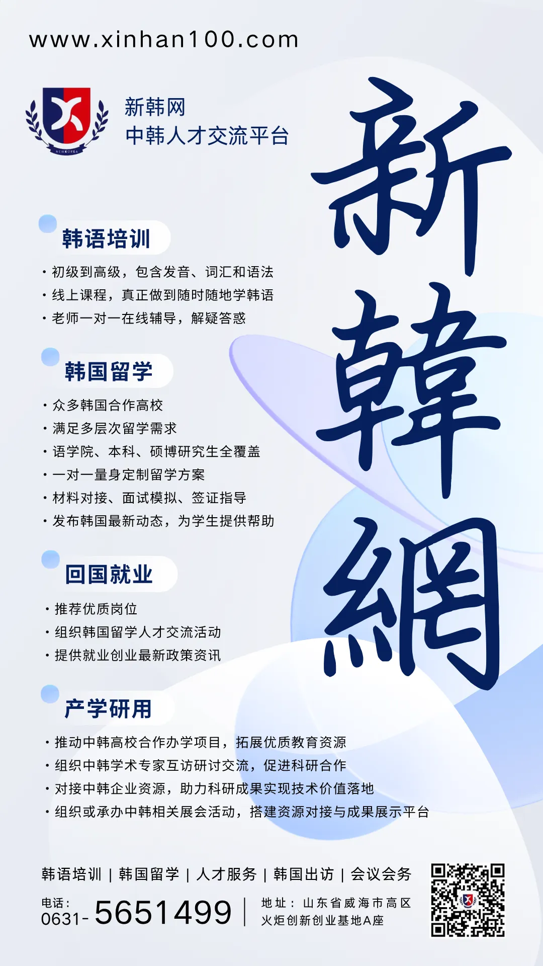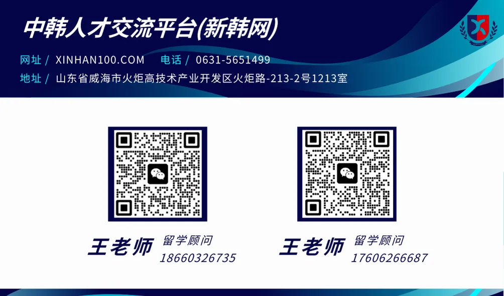 中韩人才交流平台(新韩网)拥有韩国留学专业团队,提供留学咨询、韩语培训、留学申请、韩国学习生活指导、回国就业推荐等全方位服务,为你打造全新留学体验!(网址:https://www.xinhan100.com/)
