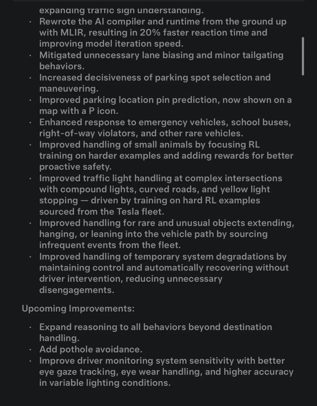 • 升级了神经网络视觉编码器,提高了在罕见和低能见度场景下的理解能力,增强了对 3D 几何图形的理解能力,并扩展了对交通标志的理解能力