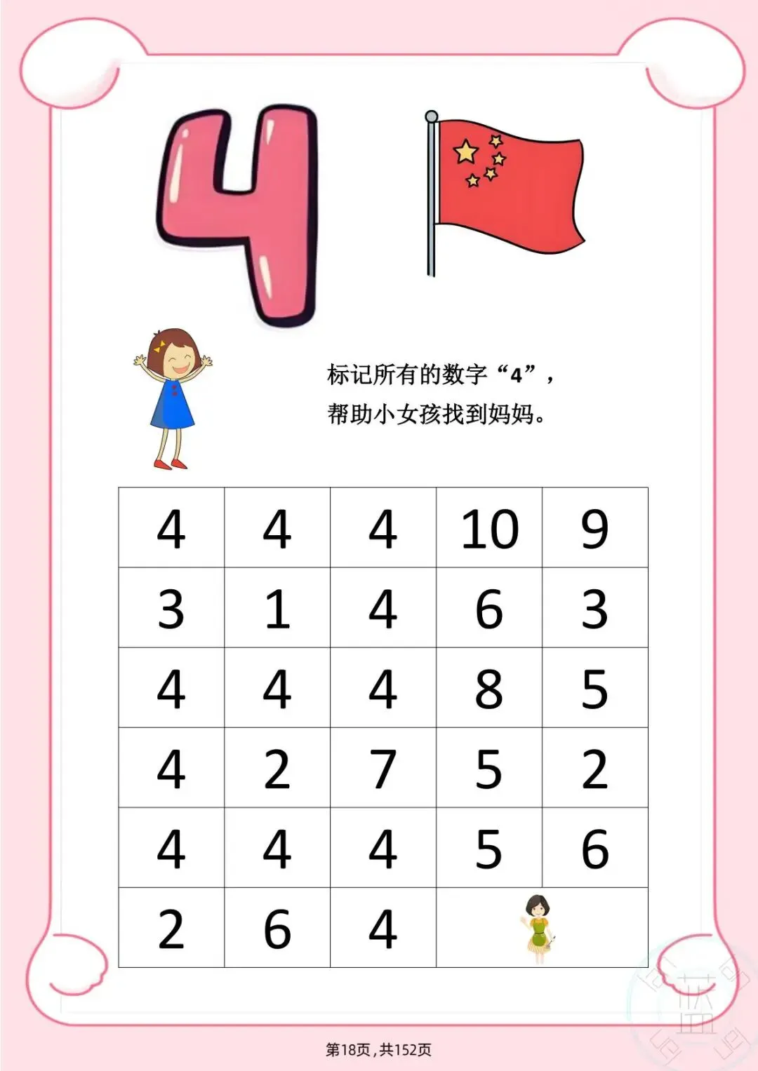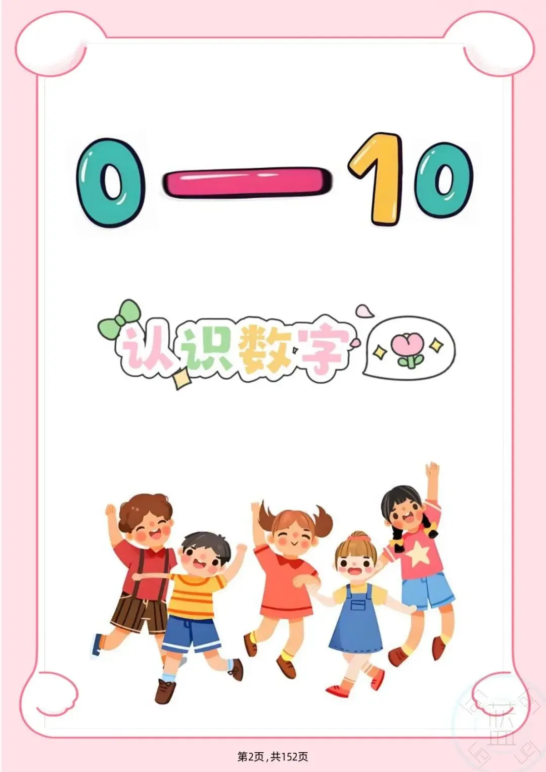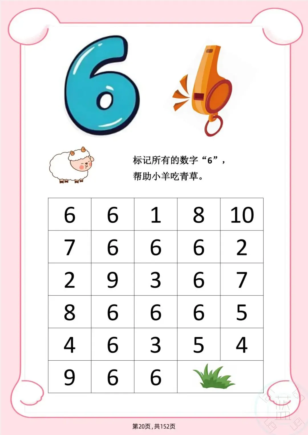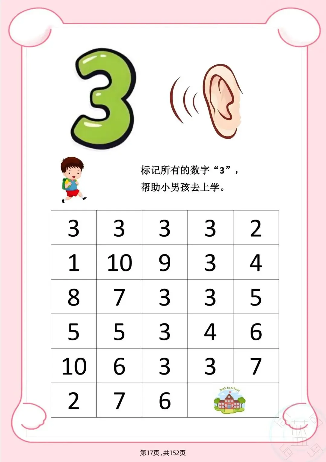3-6岁幼儿数感启蒙共150页,电子版可打印,包含数学1-10的认识、数物对应、数一数、连一连、找相同、相邻数、数的分合、找规律、10以内的加减法等内容,每天学1-2页,轻松培养宝贝数学思维,需要的家长们给孩子领取一份玩起来吧。