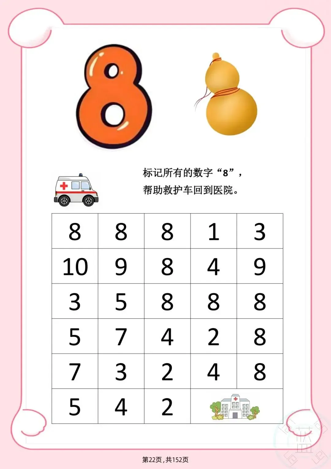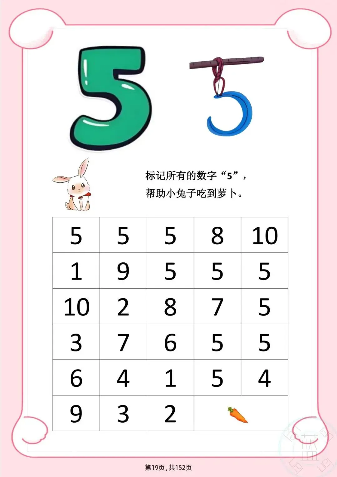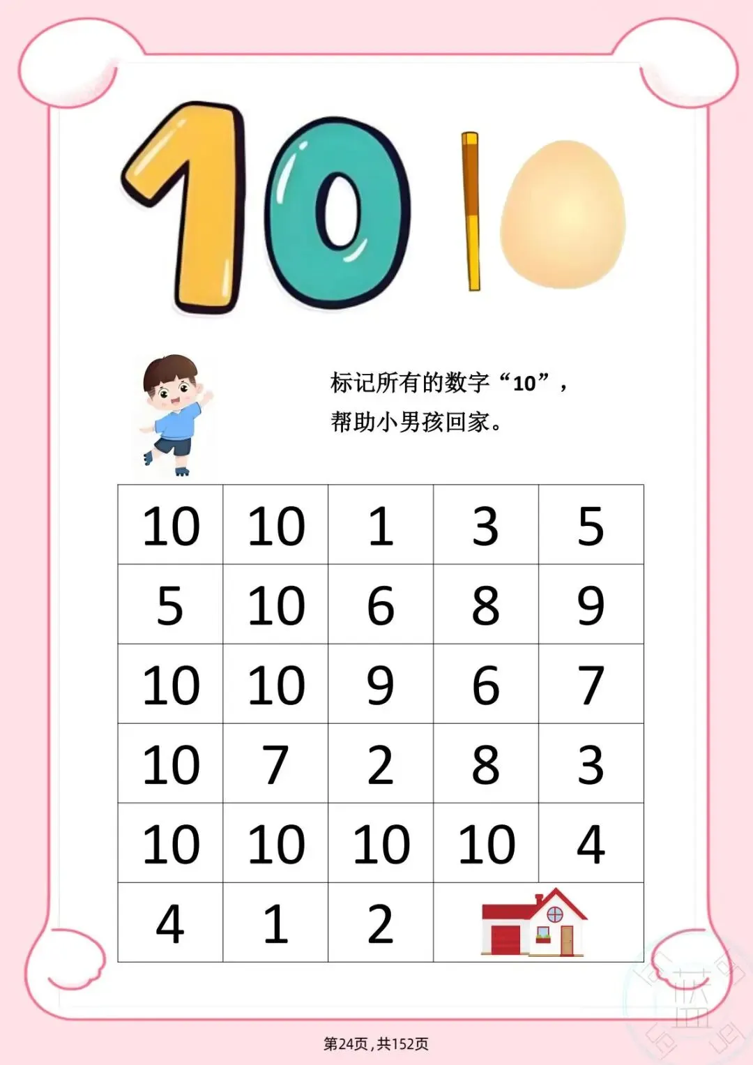 3-6岁幼儿数感启蒙共150页,电子版可打印,包含数学1-10的认识、数物对应、数一数、连一连、找相同、相邻数、数的分合、找规律、10以内的加减法等内容,每天学1-2页,轻松培养宝贝数学思维,需要的家长们给孩子领取一份玩起来吧。