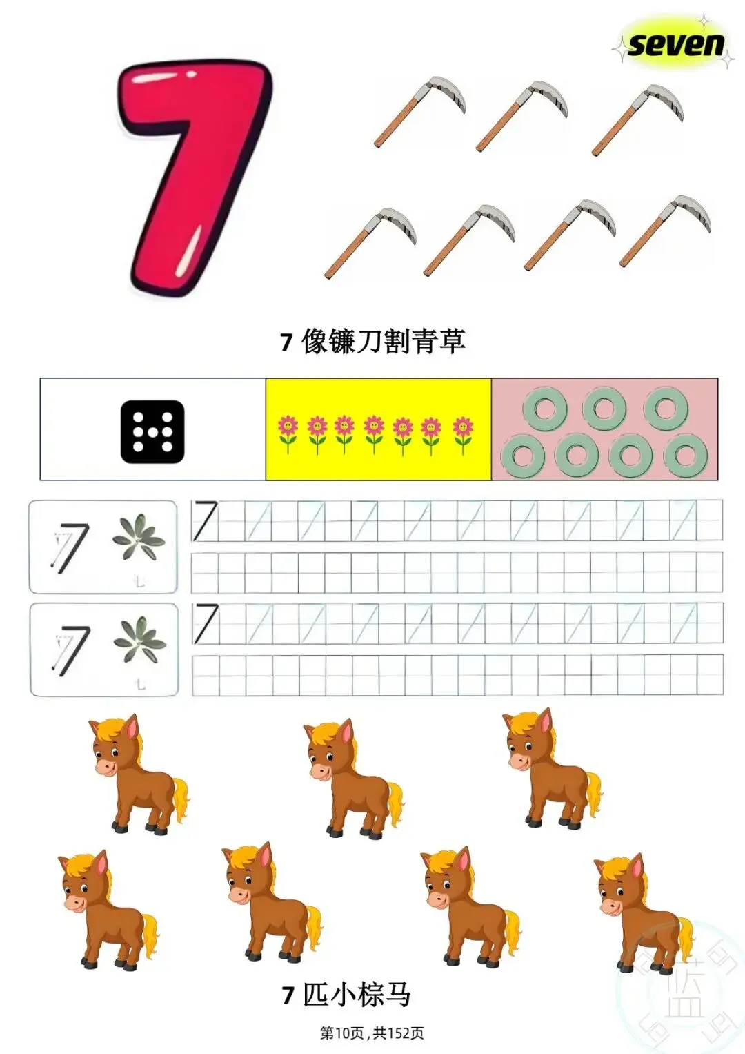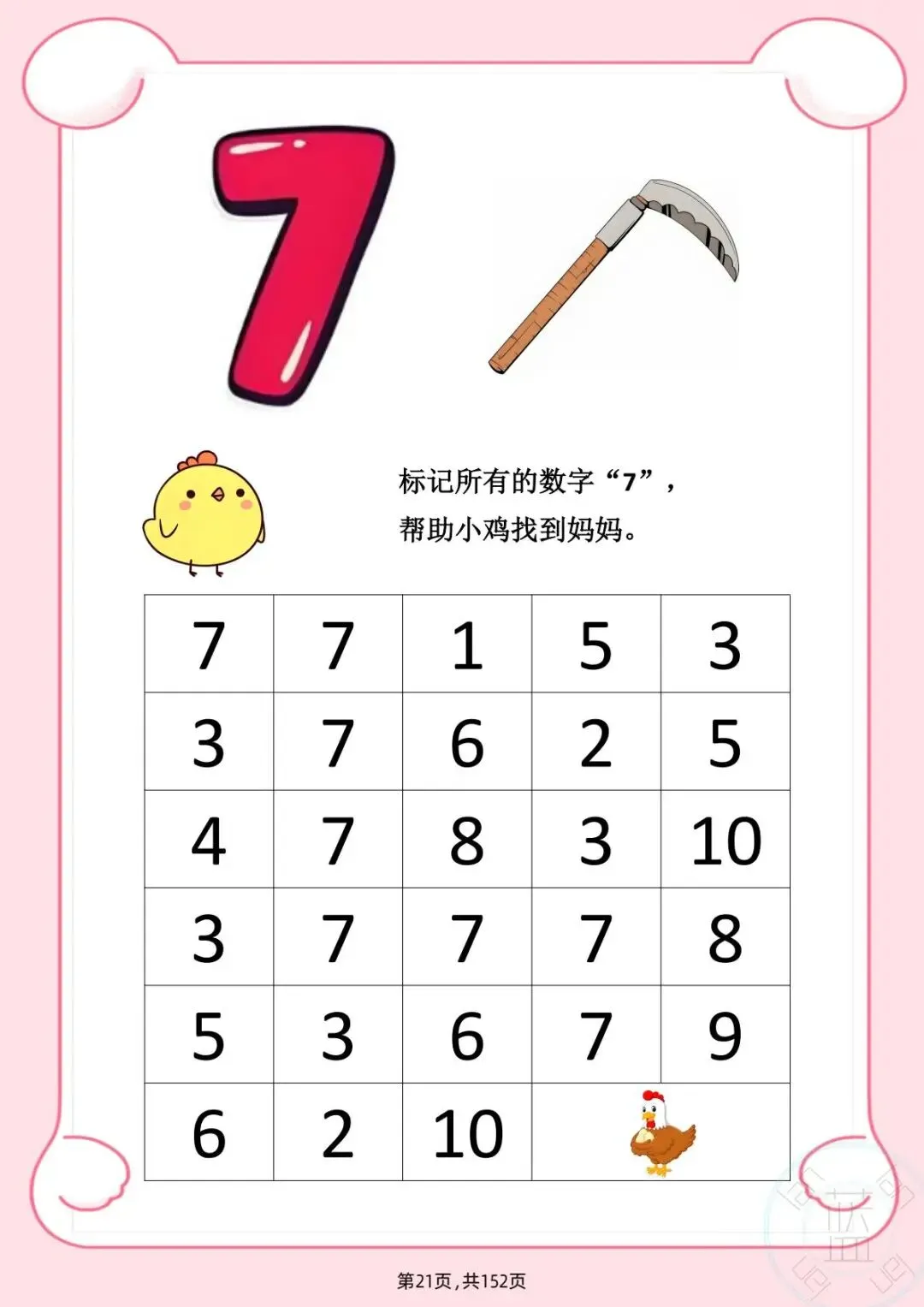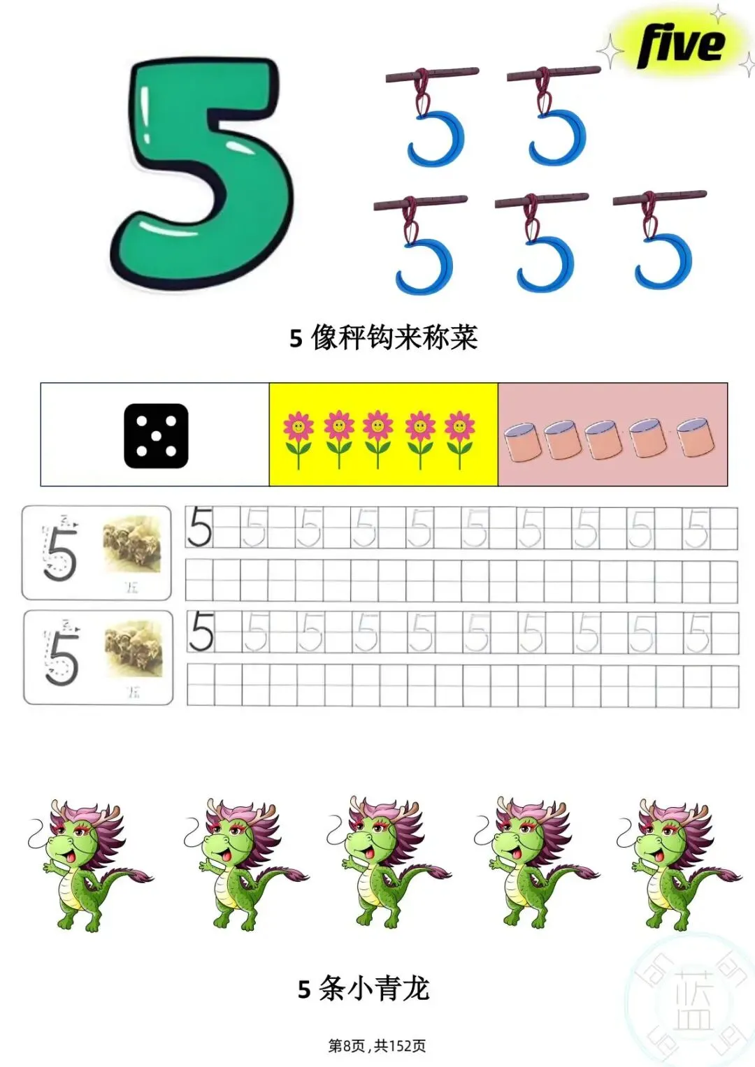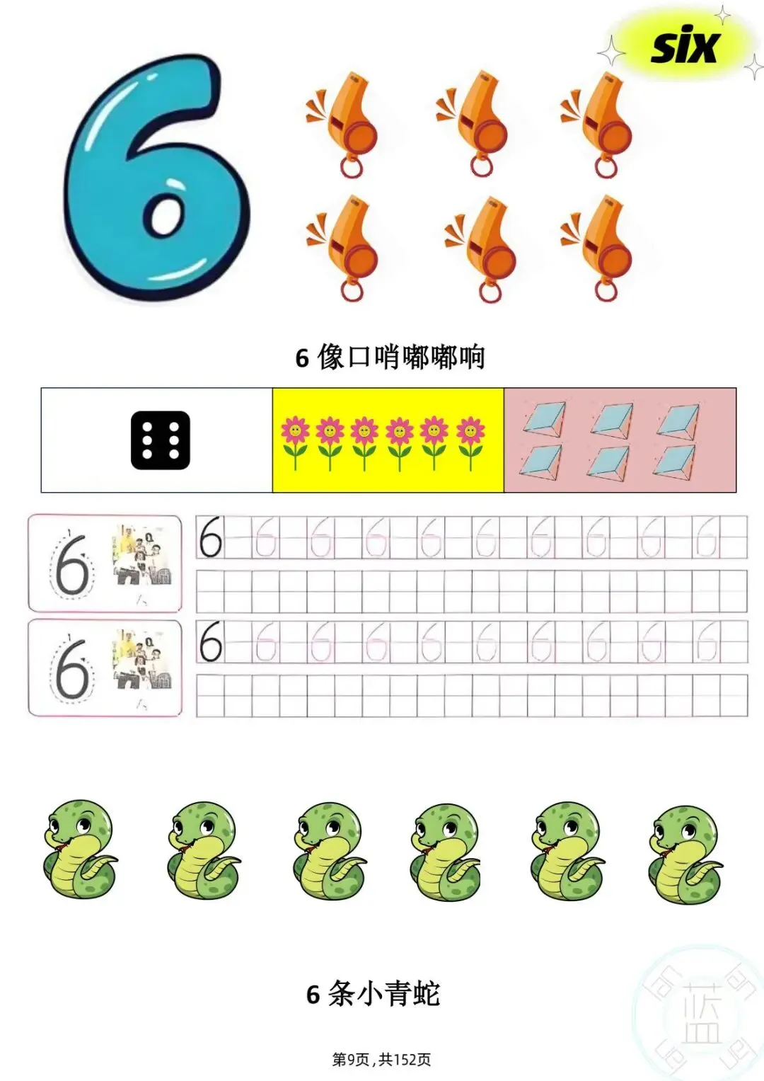 3-6岁幼儿数感启蒙共150页,电子版可打印,包含数学1-10的认识、数物对应、数一数、连一连、找相同、相邻数、数的分合、找规律、10以内的加减法等内容,每天学1-2页,轻松培养宝贝数学思维,需要的家长们给孩子领取一份玩起来吧。