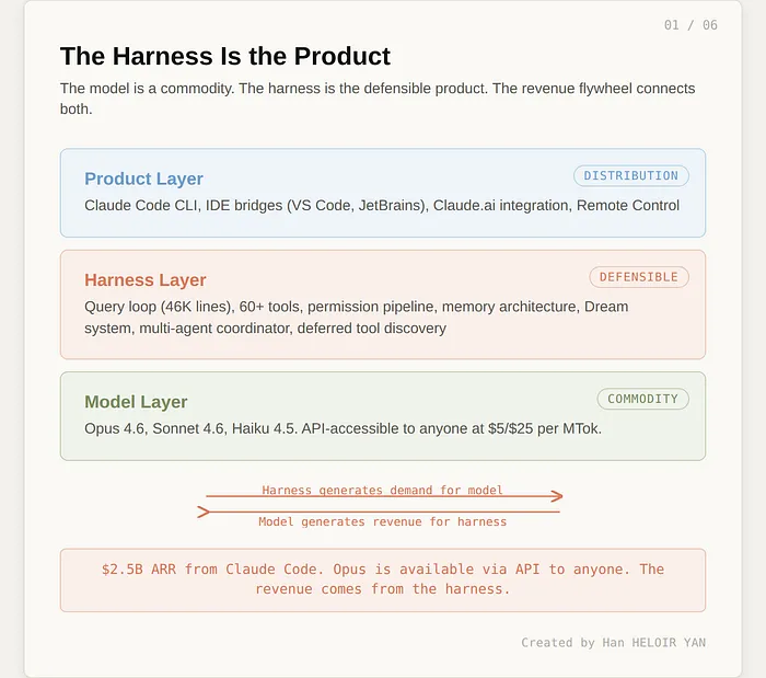 数据站在了后者一边。Opus 4.6 模型 API 对所有人开放,定价为每百万 Token 5/25 美元,可据 VentureBeat 报道,仅 Claude Code 就实现了 25 亿美元年化 recurring revenue,其中 80% 来自企业客户。开发者付费的对象并非模型,而是让模型真正落地实用的框架:工具编排、权限体系、上下文管理、错误恢复。剥离这些,它只是昂贵的自动补全工具。