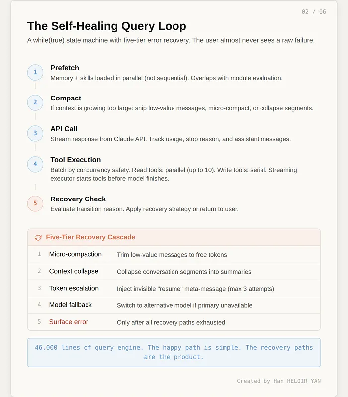 这给智能体开发者带来反直觉启示:可靠性并非核心流程完成后的附加功能,核心流程本身就是可靠性系统。Claude Code 查询引擎 4.6 万行代码的体量,并非源于正常流程复杂,而是因为恢复路径过于繁琐。