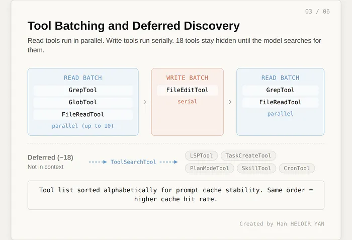 工具执行层面同样做了优化:循环不会逐个运行工具,而是根据并发安全等级分组。每个工具通过isConcurrencySafe()方法声明是否支持并行,grep、文件读取等只读工具可同时运行 10 个,文件编辑、带副作用的终端命令则串行执行,读写批次交替执行。流式执行器还能在模型生成输出时同步运行工具,重叠计算与 I/O 降低延迟。