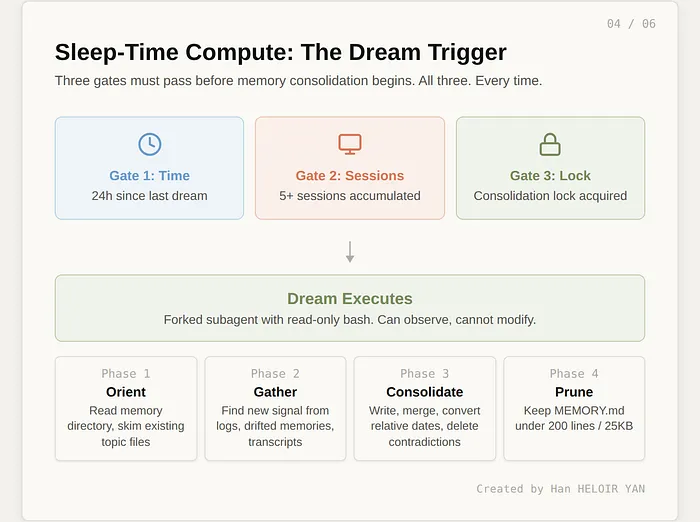 - 时间关卡:距上一次梦境至少间隔 24 小时,避免频繁短会话导致过度整合