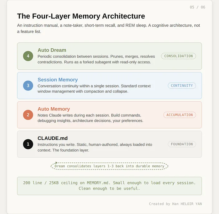 - 自动梦境:跨层周期性记忆整合,相当于垃圾回收、碎片整理、快速眼动睡眠