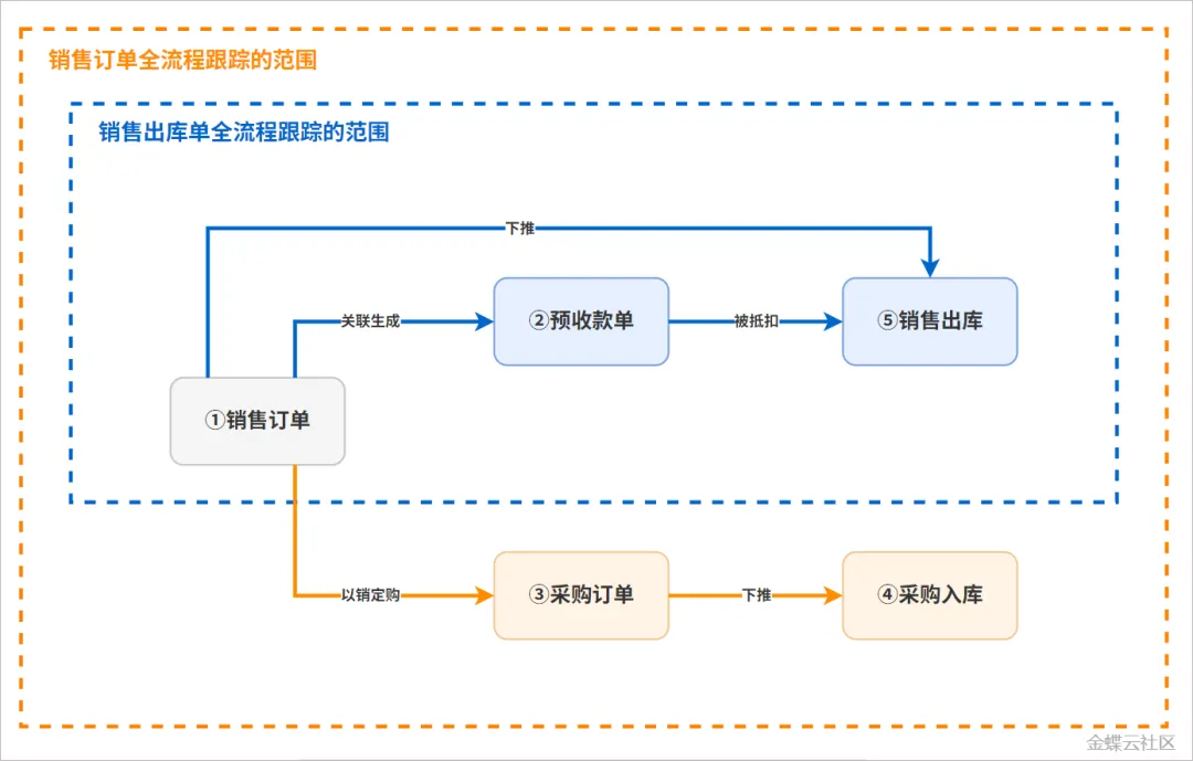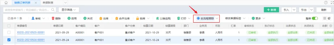 全流程跟踪①销售订单时,可以查到上面②③④⑤所有单据,因为全部都是通过①发起后关联起来的。