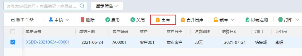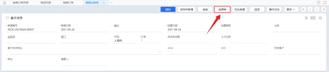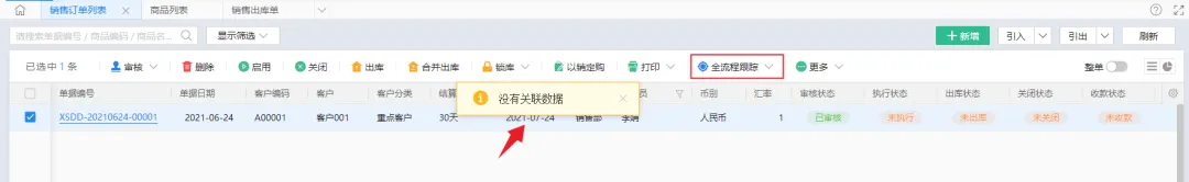 划重点l啦!【全流程跟踪】是通过源单下推来关联的,如果要使用全流程跟踪,必须通过源单直接下推(在单据列表或者单据详情页单击“出库”)或者新增下游单据时单击“选源单”来关联。