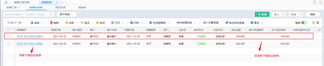 例:做销售订单XSDD-20210924-00001,下推了出库单XSCK-20210929-00066,在销售订单列表进行全流程跟踪查询时,在单据联查中,发现出现了跟源单不相关的其他销售出库单XSCK-20210929-00067?这是为什么?