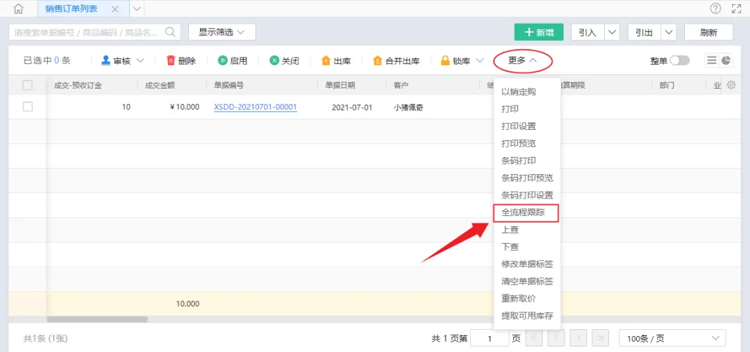 回答:当单据列表的菜单按钮比较多时,电脑页面无法全部展示时(例如笔记本电脑的屏幕通常比较小),“全流程跟踪”按钮会隐藏在“更多”里面,点击下拉就能看到。