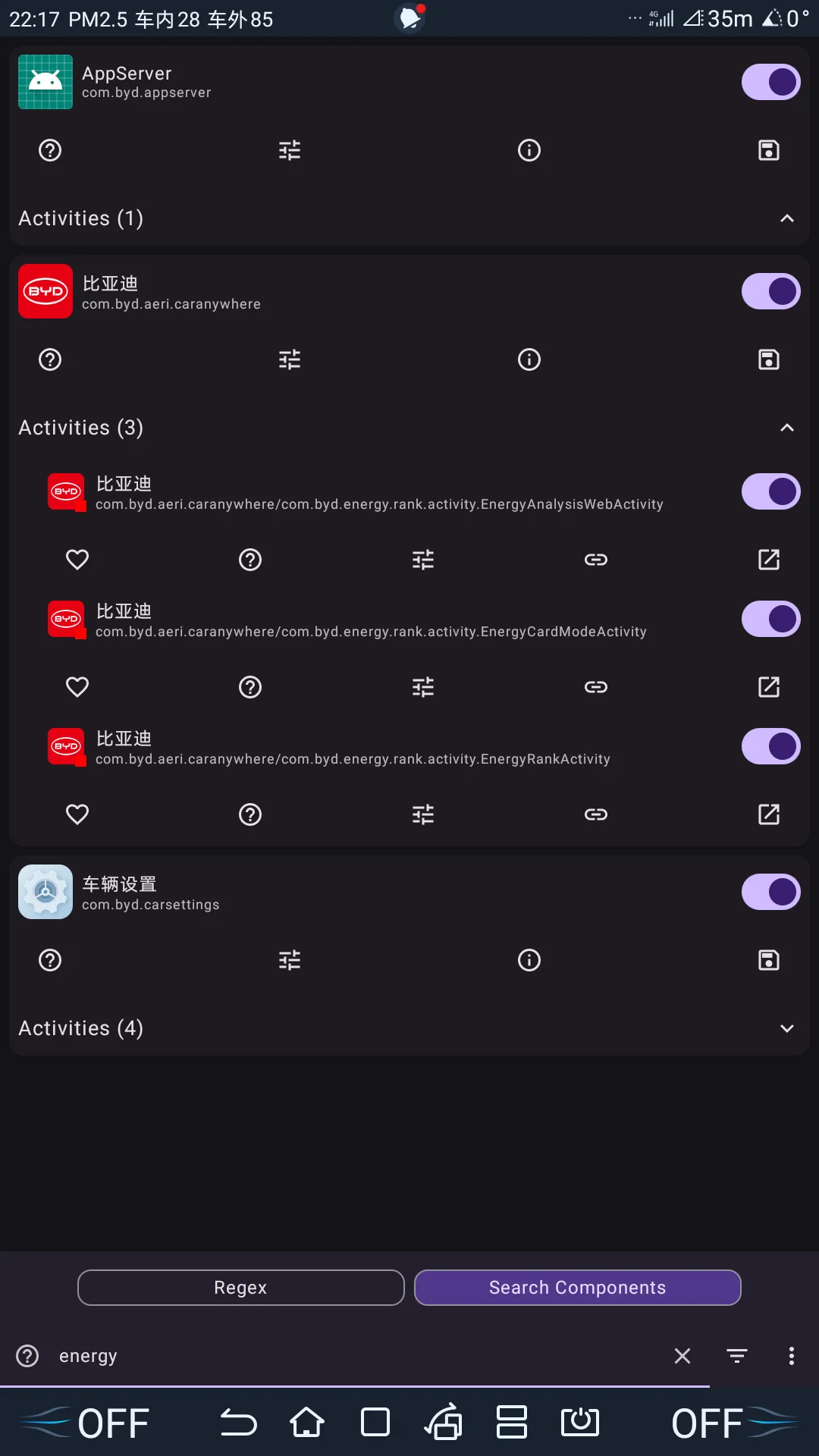 然后点击底部的搜索按钮,搜索比亚迪 App 的隐藏界面,选择 Search Components 并输入关键词: