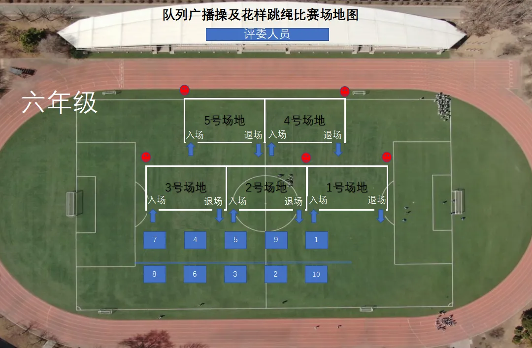 3.第二场比赛班级按照图上所示的位置成四路纵队站好候场,待第一场比赛班级完全退场后方可进入,在入口处做好比赛准备。