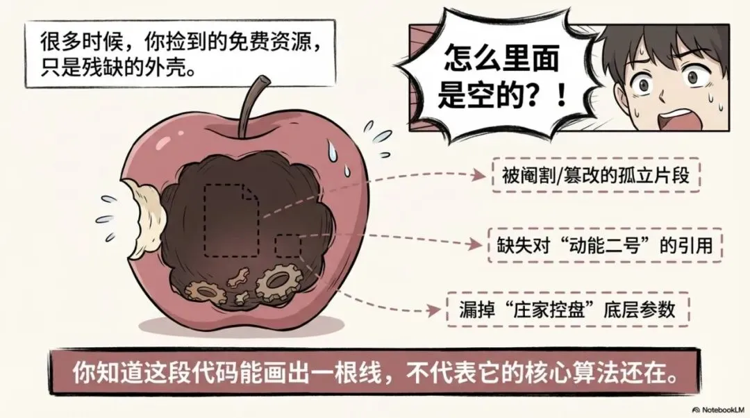但问题是,这些被随意丢在网上的免费代码,很多时候是被阉割或篡改过的孤立片段。