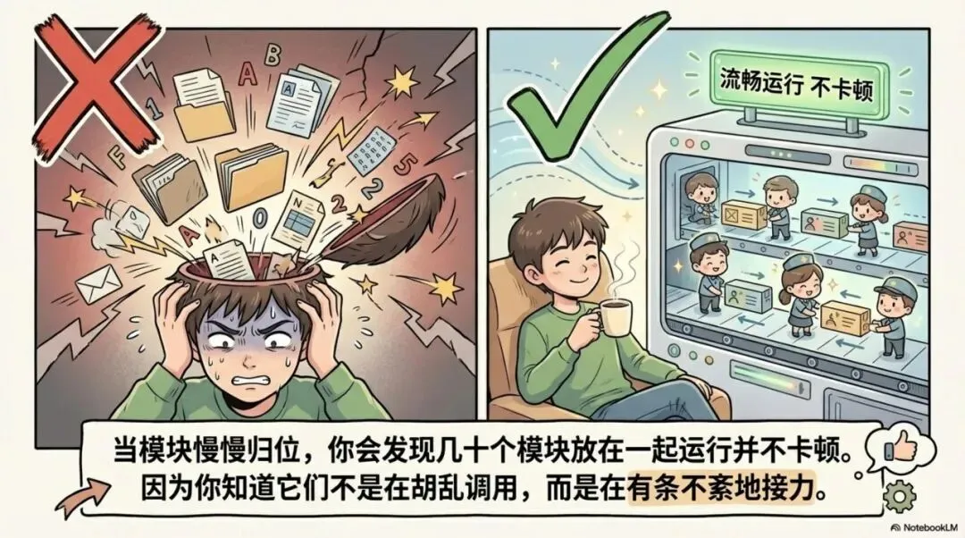如果这些关系都是散的,那你攒的文件包再大,脑子里留下来的也只是一堆无法协同的乱码。 而如果这些位置都慢慢归位,你会发现几十个模块放在一起运行并不卡顿,因为你知道它们不是在胡乱调用,而是在有条不紊地接力。