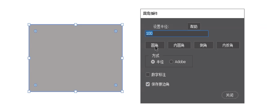 其中,插件内置四种边角模式:圆角、内圆角、倒角、内折角,同时支持随时修改半径数值,适配多样化的设计需求。