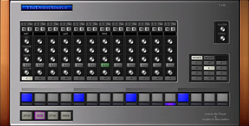 TheDrumSource内置音序器,可创建出复杂的鼓节奏型,插件的节奏库也提供了24种节奏型。插件的每个通道都提供声像、音量、音高、长度和摇摆旋钮,精准控制每个音色。