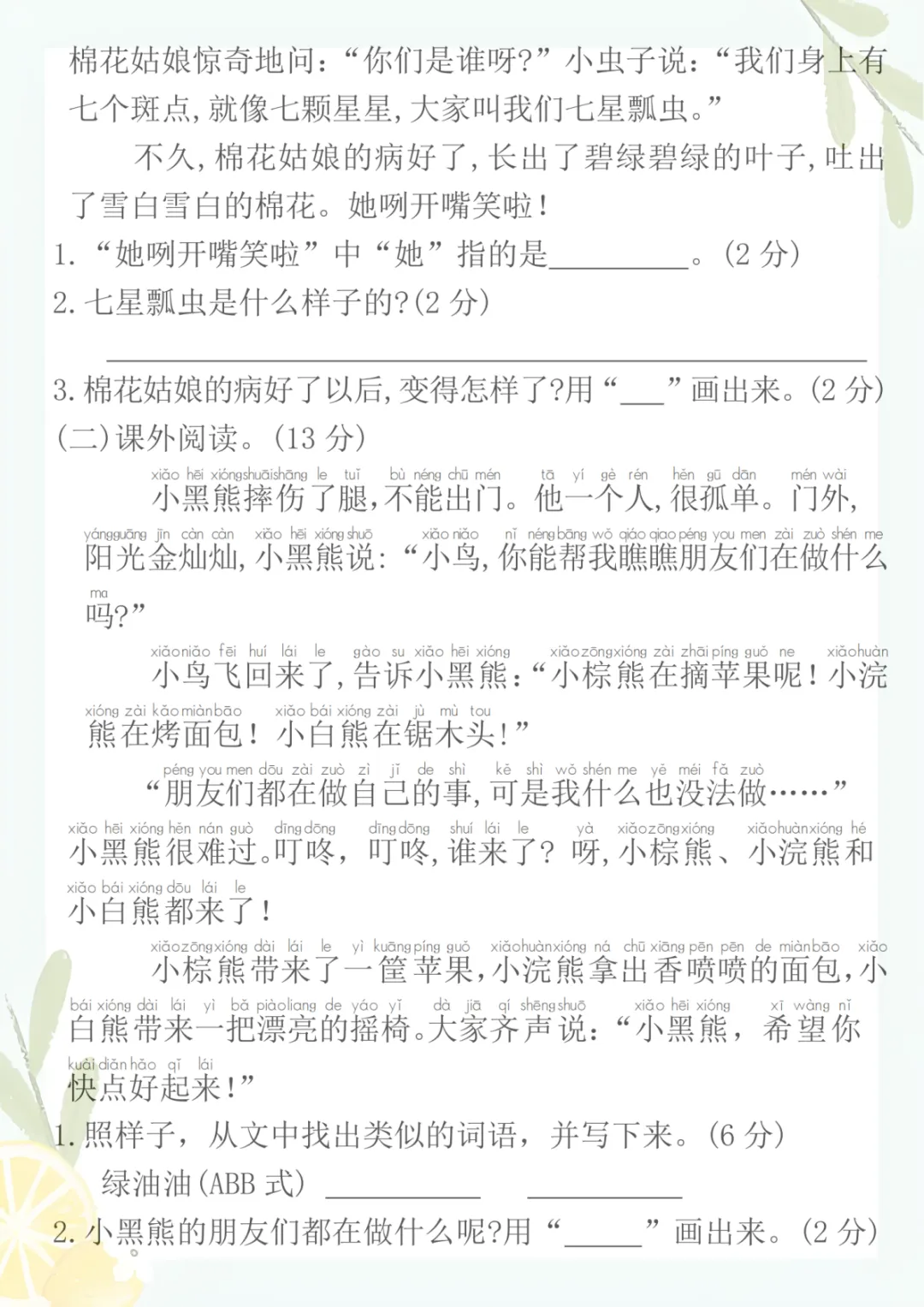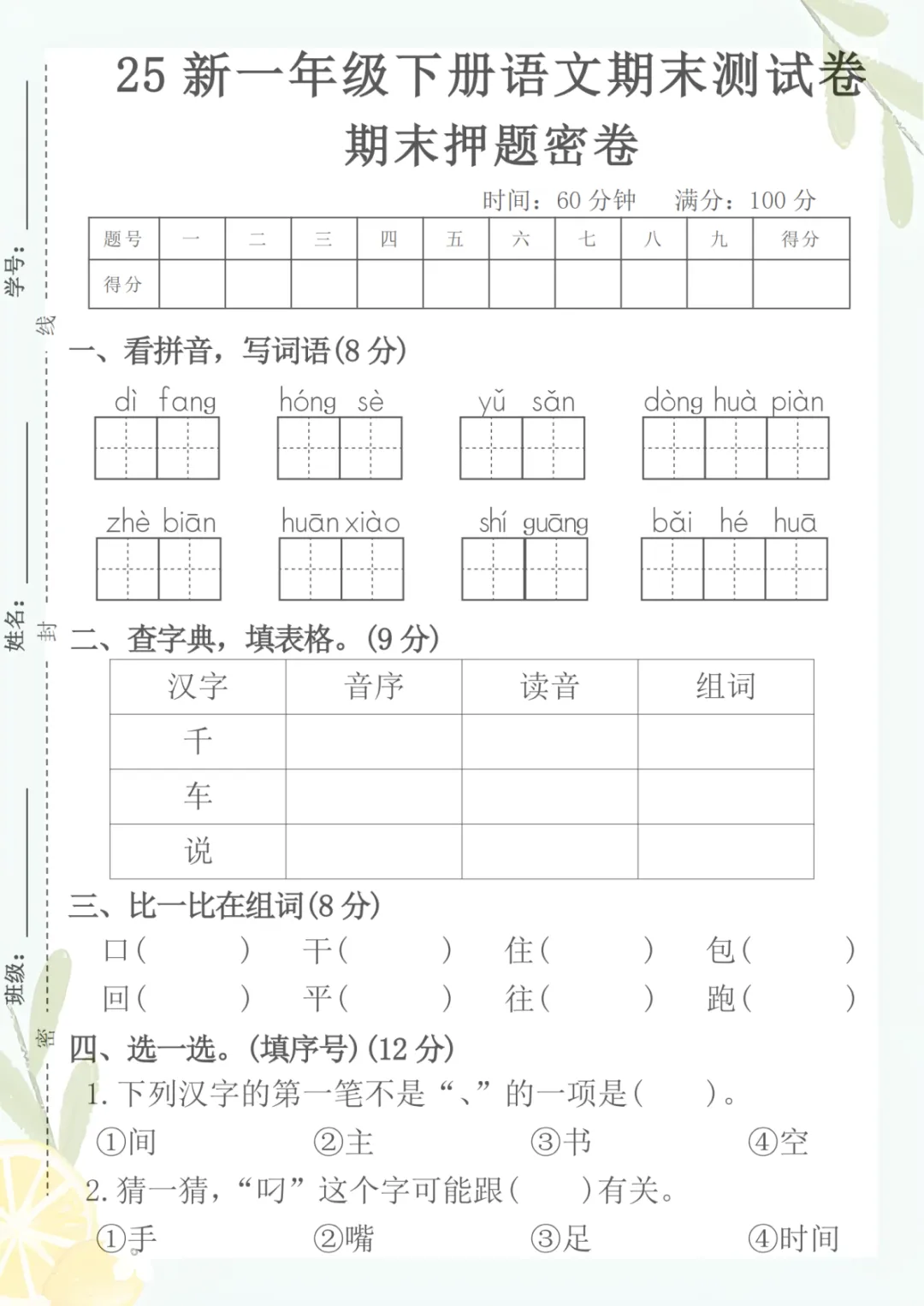 【期末押题卷】一下语文,共4页,电子版可下载可打印,这份一年级下册语文期末押题练习紧扣期末复习需求,涵盖多个核心知识点与专项训练内容,帮助孩子在考前进一步梳理所学、查漏补缺,熟悉题型与答题节奏,系统强化本学期重点内容。需要的家长可以及时下载打印出来,让孩子考前练一练,更有针对性地做好期末准备。