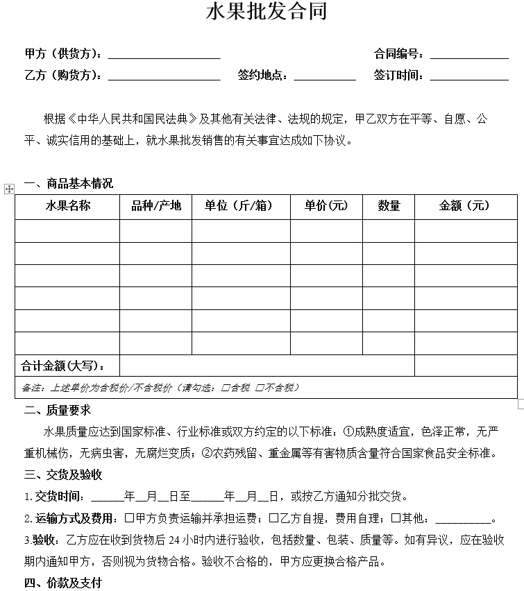 根据《民法典》及其他有关法律、法规的规定,甲乙双方在平等、自愿、公平、诚实信用的基础上,就水果批发销售的有关事宜达成如下协议。