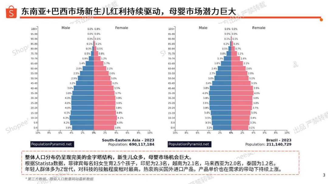 人口红利持续:东南亚(尤其是菲律宾、印尼、越南)及巴西市场新生儿数量多,人口结构呈金字塔型,母婴市场需求巨大且持续增长。