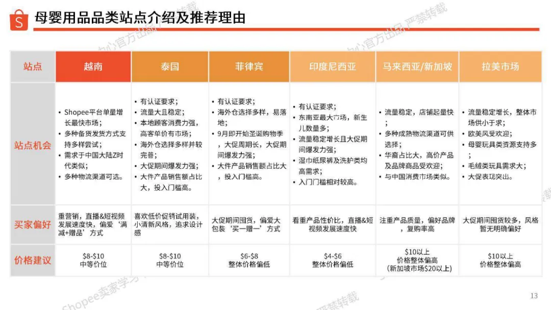 成熟卖家/有供应链优势:主攻马来西亚、新加坡或巴西,切入纸尿裤、婴儿车、安全座椅、电器等高客单价品类,走品牌化路线。