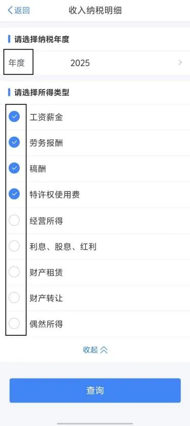 ①您可以选择纳税年度,综合所得(含工资薪金、劳务报酬、稿酬、特许权使用费)已默认勾选。