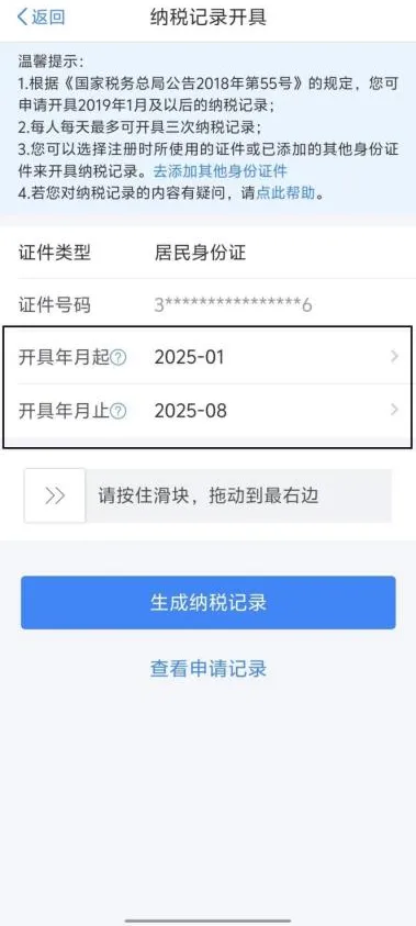 ②选择需要开具的年月,按住界面上的滑块控件向右拖动至末端,点击【生成纳税记录】完成操作。