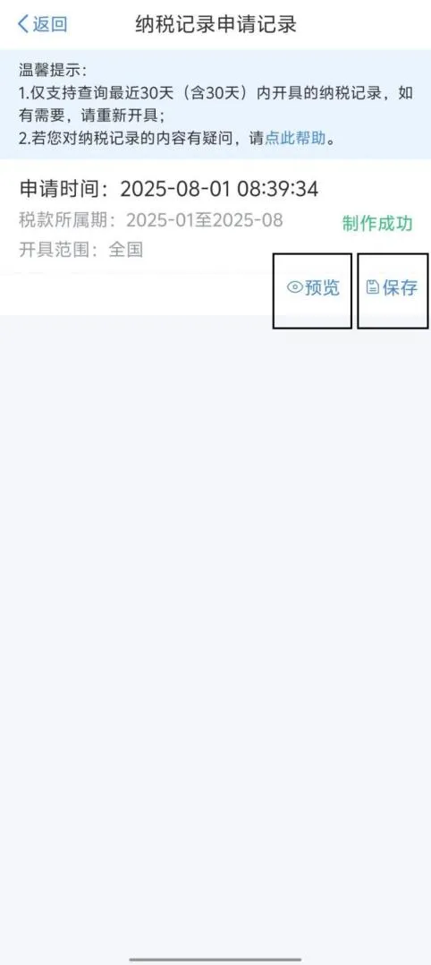 ③系统显示“制作成功”后,点击【预览】按钮查看纳税记录(确认无误后,可长按预览图片选择保存至手机相册);或直接点击【保存】按钮,一键保存纳税记录图片到手机相册。