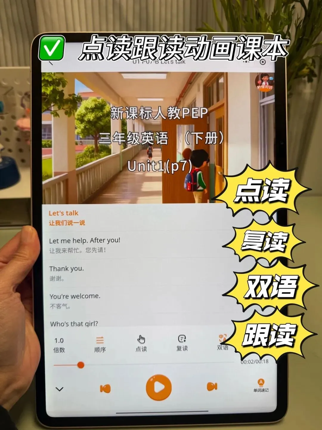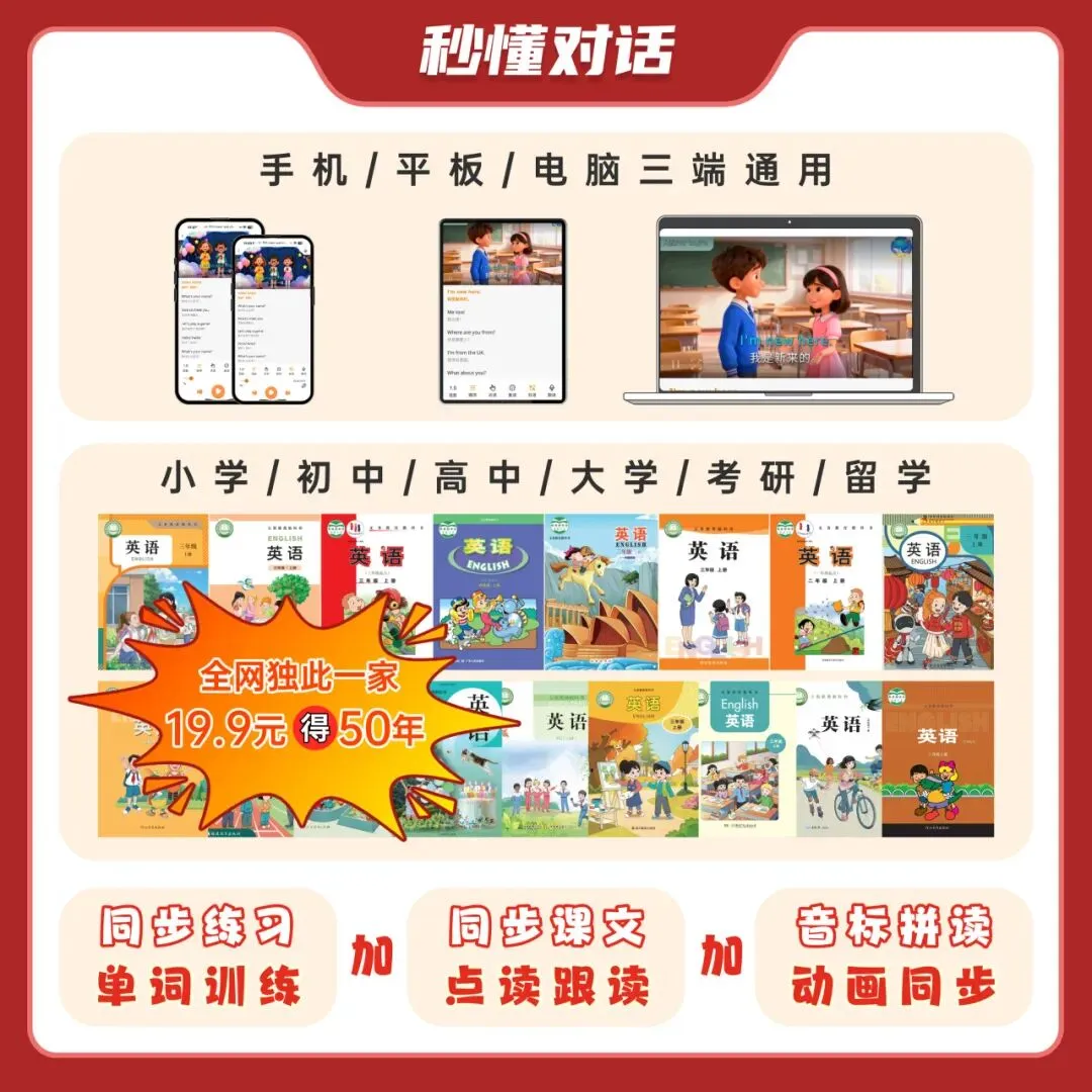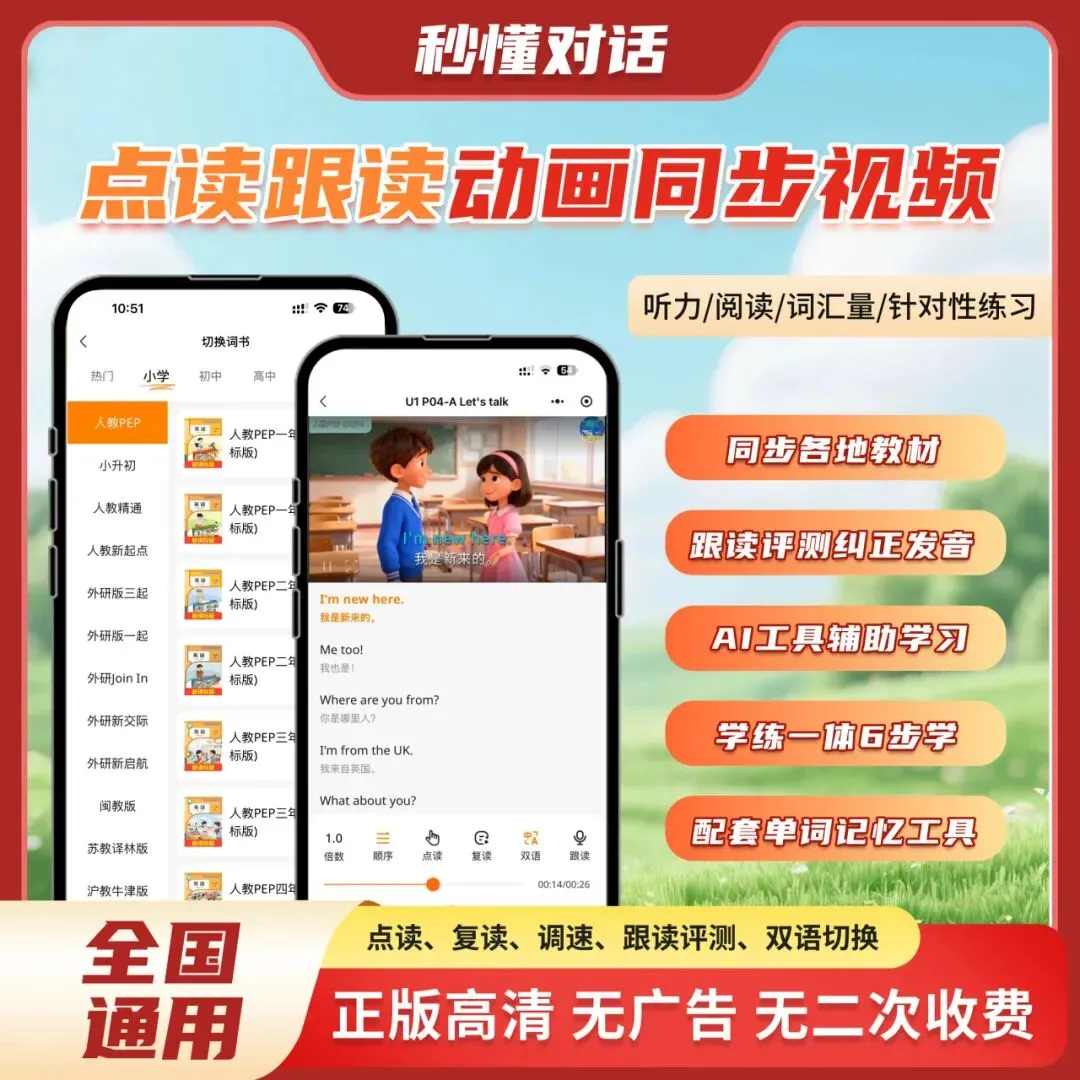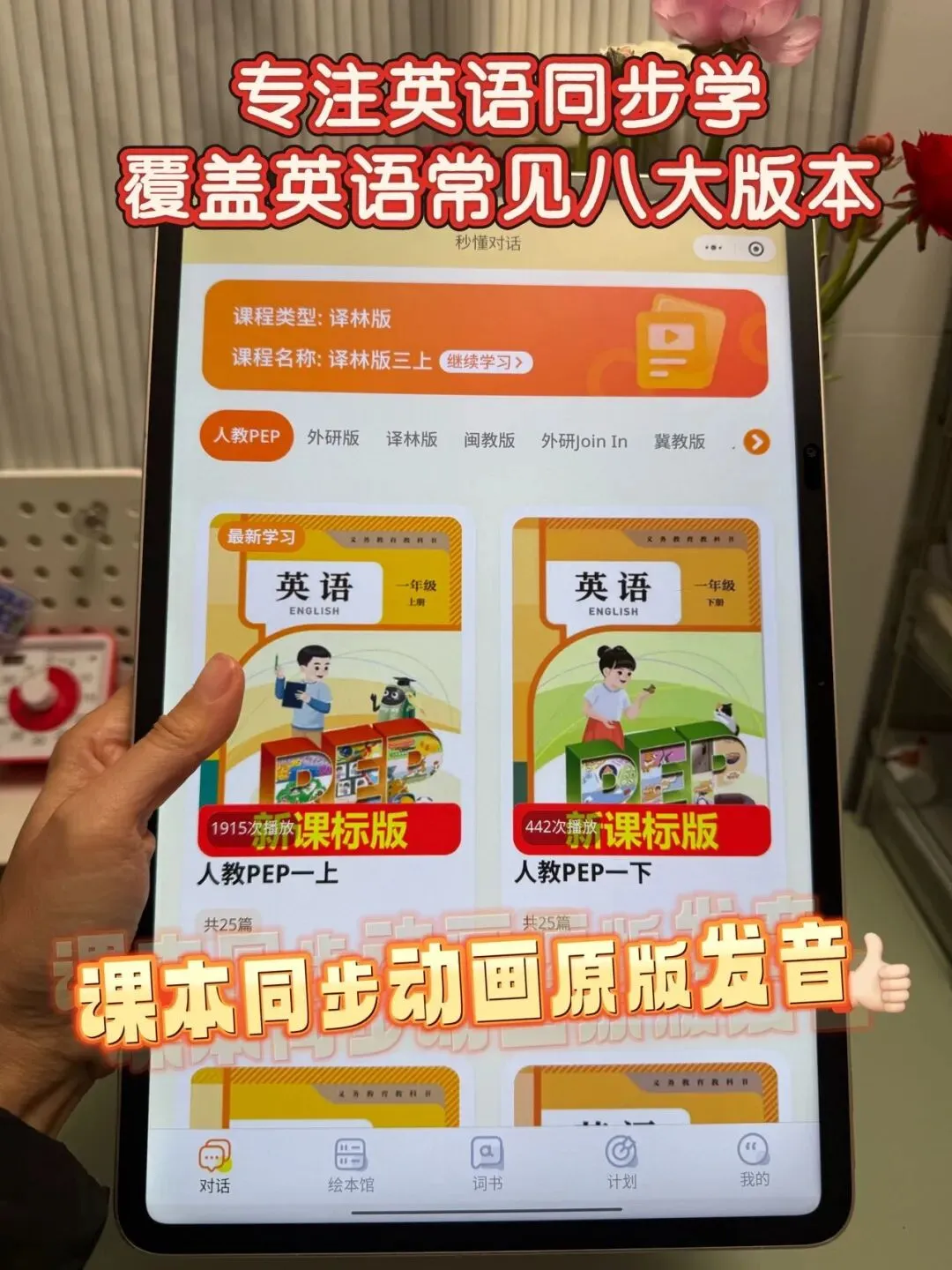 ✅ 课本同步太省心:人教PEP、外研版… 全国教材都能匹配,娃学的课文直接在APP里变成动画对话,像看英语短片一样,再也不抵触读课文