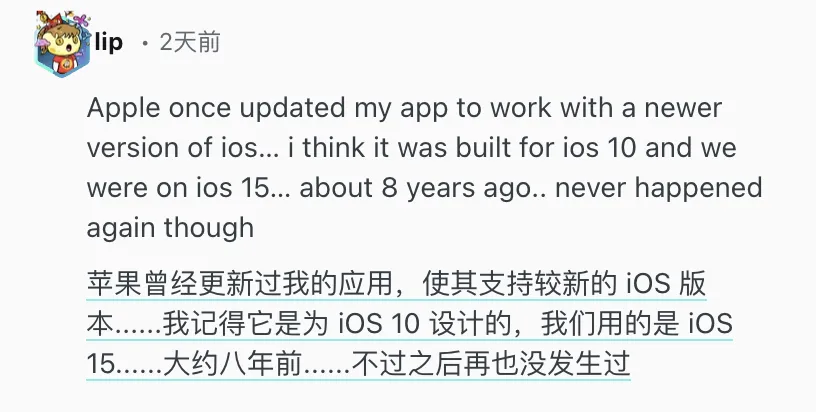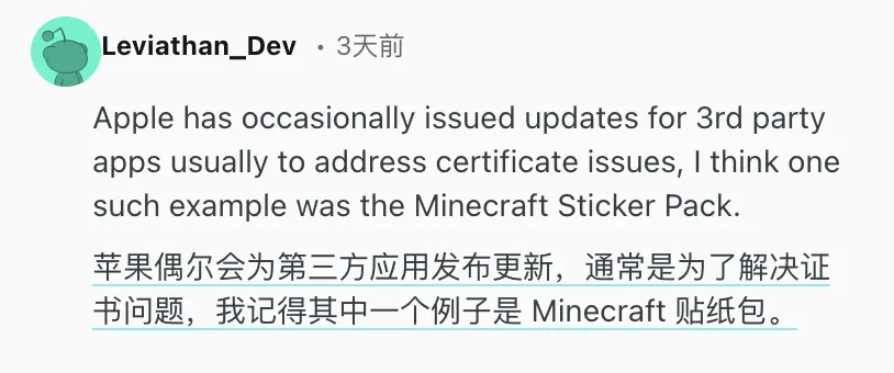 也有开发者提到,苹果偶尔会为第三方应用更新,通常与证书问题或系统兼容有关。