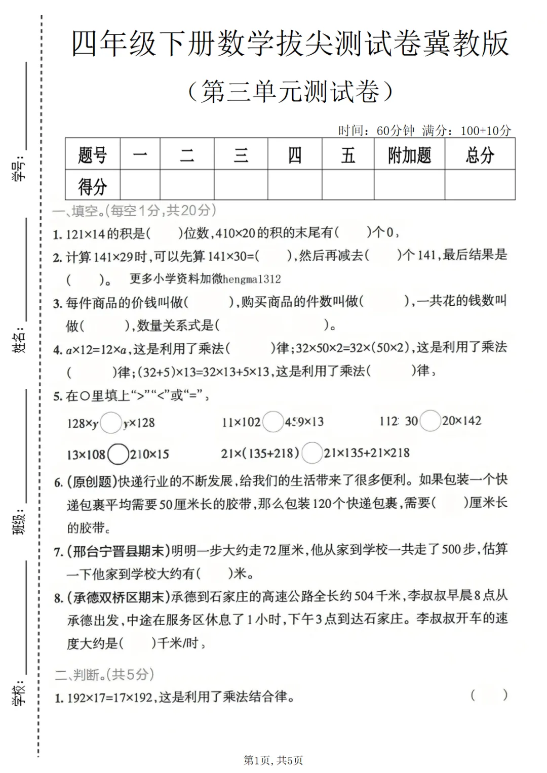 【免费下载】四年级(下)数学 第三单元拔尖测试卷《冀教版》,PDF电子版,共5页,先保存,以免资源失效