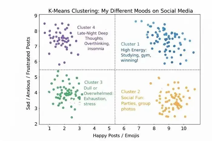数据显示,我不只是数据字节小姐这个人,算法把我分成好几个 K-Means 聚类。不同时间、不同行为,就把我当不同人。看我情绪分类:
