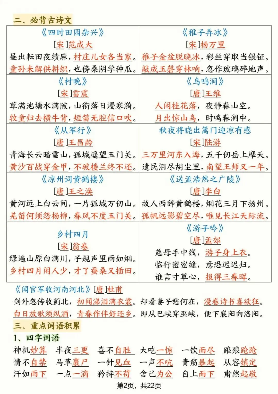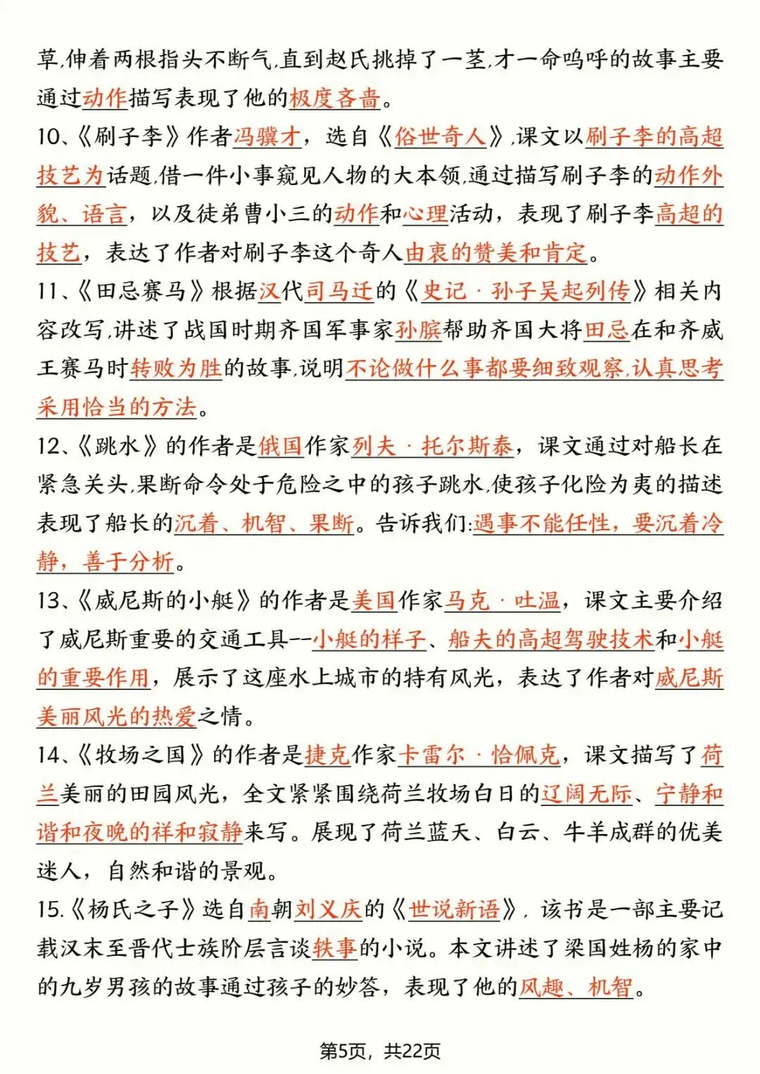 五年级下册语文全册高频考点总结 完整电子版可下载打印