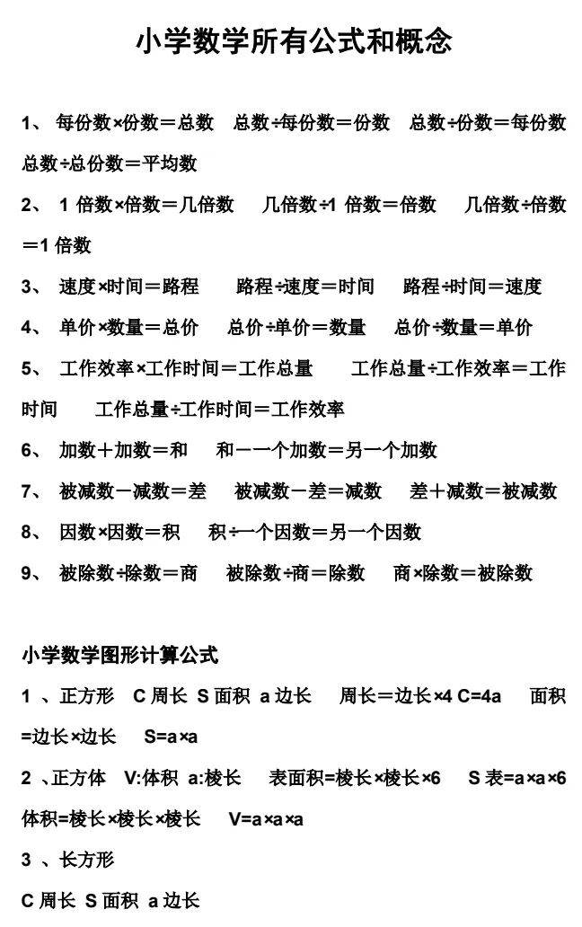 【小学数学】 公式总结1-6年级上下册可下载打印,一二三四五六年级都可以背一背